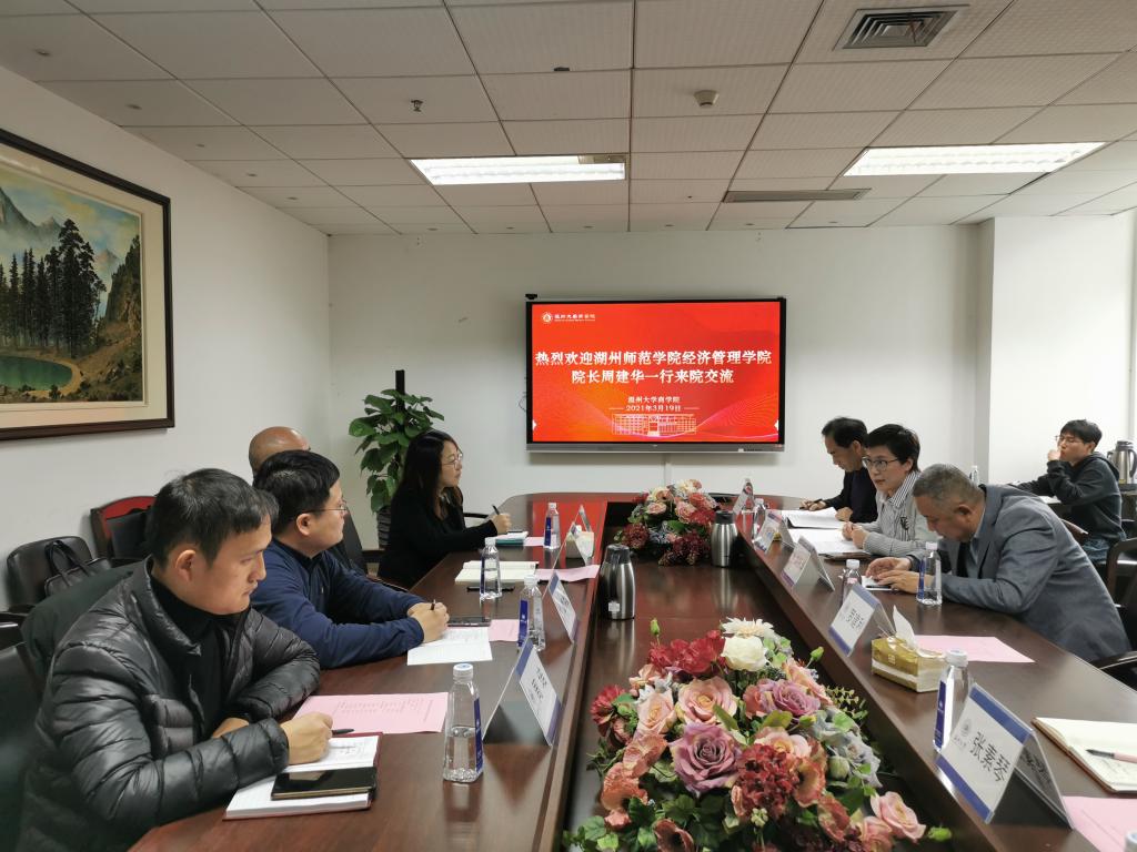 2021年3月19日,湖州师范学院经济管理学院院长周建华、副院长唐洪雷、副院长杨振华、综合办主任周培一行来院交流,双方在信息楼A222展开座谈会就硕士点建设和专业发展等相关工作进行交流。免费黄色网站院长胡振华、院党委书记郑彩莲、副院长罗建利、副院长余向前、院长助理徐正、工商管理系主任张启明及学院办公室主任张素琴等参加交流。