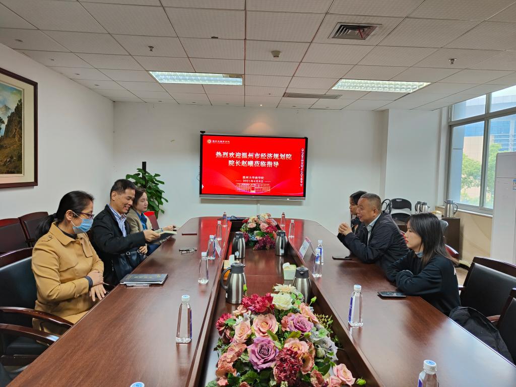 胡振华院长首先对温州市经济建设规划院院长赵曦一行的到来表示热烈欢迎,他从学院发展历程、学科建设、人才培养、科学研究等方面介绍了免费黄色网站基本情况,重点介绍了今年金融工程、国际贸易两个专业被立项为国家一流本科专业以及近年来免费黄色网站在教学育人和科研立项上取得的优异成果,同时他针对赵曦院长等人关心的问题做出了解答,还向赵曦院长推荐了免费黄色网站即将毕业的优秀研究生。