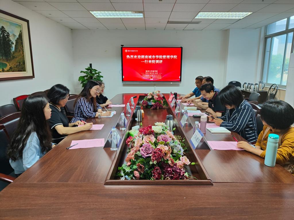 2021年5月18日,湖南城市学院管理学院周琼、郭美兰系主任一行来院调研、交流,双方在信息楼A222展开座谈会进行交流。温州大学金融研究院院长程仲鸣、学院工商管理系系主任张启明、财务管理系系主任张烨及相关专业教师参加交流。