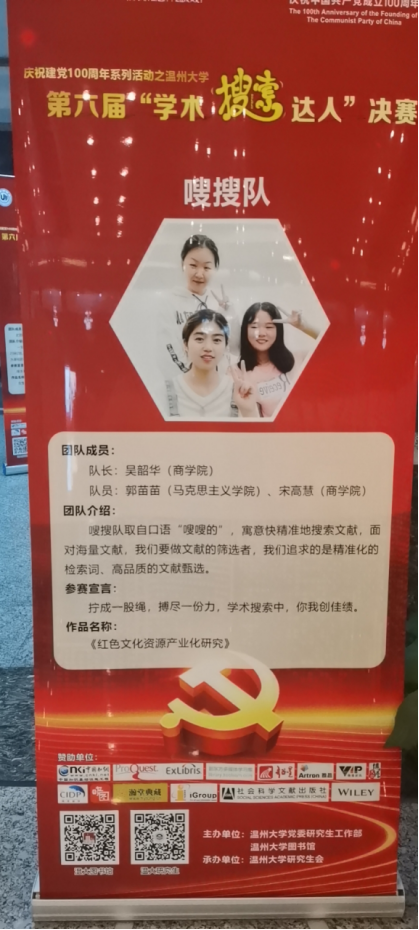 第六届“学术搜索达人”大赛决赛育英图书馆四楼举行,我院研究生吴韶华带领的“嗖搜队”脱颖而出,其作品名为《红色文化资源产业化研究》荣获决赛一等奖。