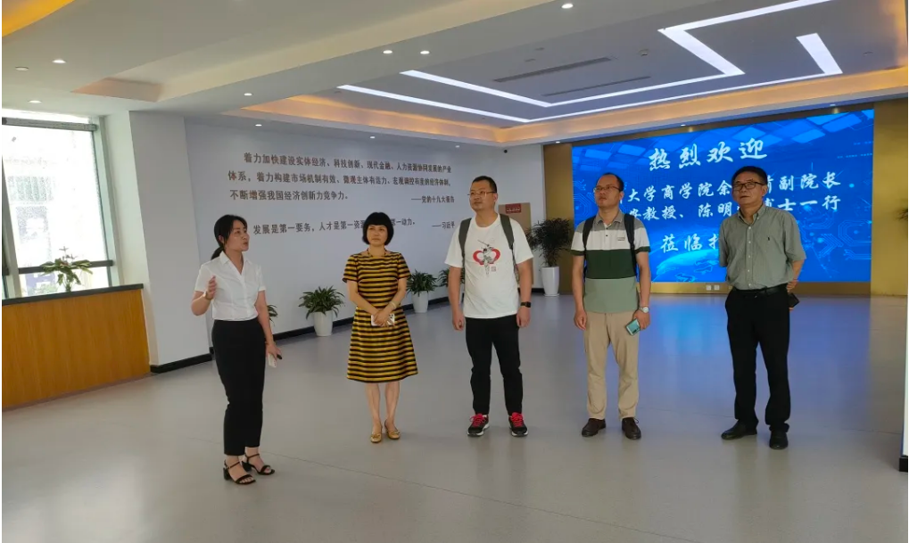 余向前副院长、来新安、陈明灼等老师在陈爱雪董事长的带领下详细参观了产业园公共服务大厅、文化墙、事记墙、人力资源产业服务共享中心、公共休闲吧和会议中心等区域,并听取了陈爱雪董事长关于园区区域规划、招商引资和最新运营进度等情况的介绍。