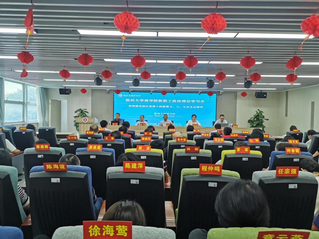 2021年9月8日上午,免费黄色网站在信息楼A226仲辉商道讲堂召开教职工理论学习大会,切实提高政治站位,认真贯彻落实浙江省委十四届第七、八、九次全会精神。全体教职工参加学习会,会议由学院党委书记郑彩莲主持。