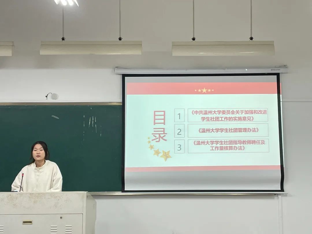 社团部执行部长王乐就《中共温州大学委员会关于加强和改进学生社团工作的实施意见》、《温州大学学生社团管理办法》和《温州大学学生社团指导教师聘任及工作量核算办法》的相关内容对各社团成员进行讲解。