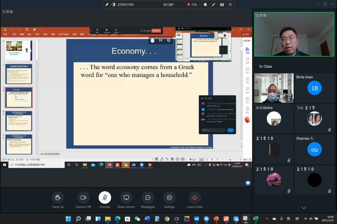 国际部王洪斌老师上课前十几分钟就把上课需要的资料在钉钉群里与学生共享,并准时以钉钉群直播的方式给学生绘声绘色的上了微观经济学第一课。在国内的留学生都加入了在线课堂,并和老师积极互动。考虑到国外学生由于时差问题无法加入课堂,王老师在上网课的同时对课堂进行了录播,保证课堂后能够将上课视频发给国外的学生结合资料进行学习,保证了学生参与的积极性与学习质量。整个课堂过程讲述流畅,学生积极性高,教师的准备与投入都非常充分。