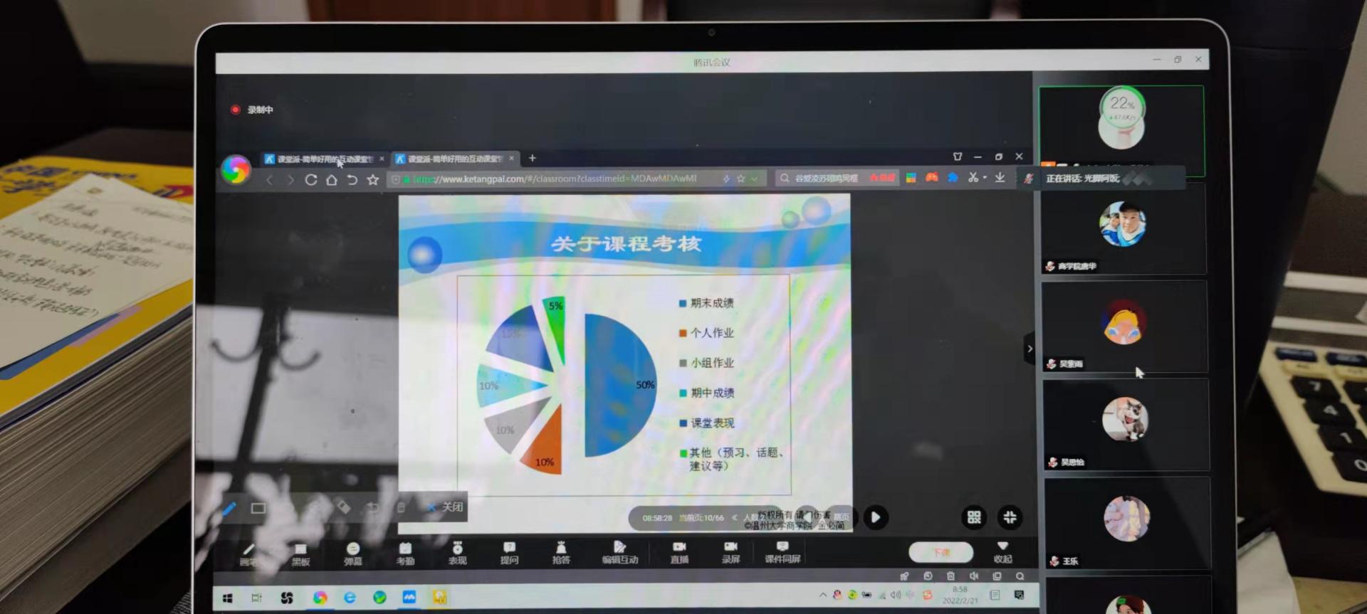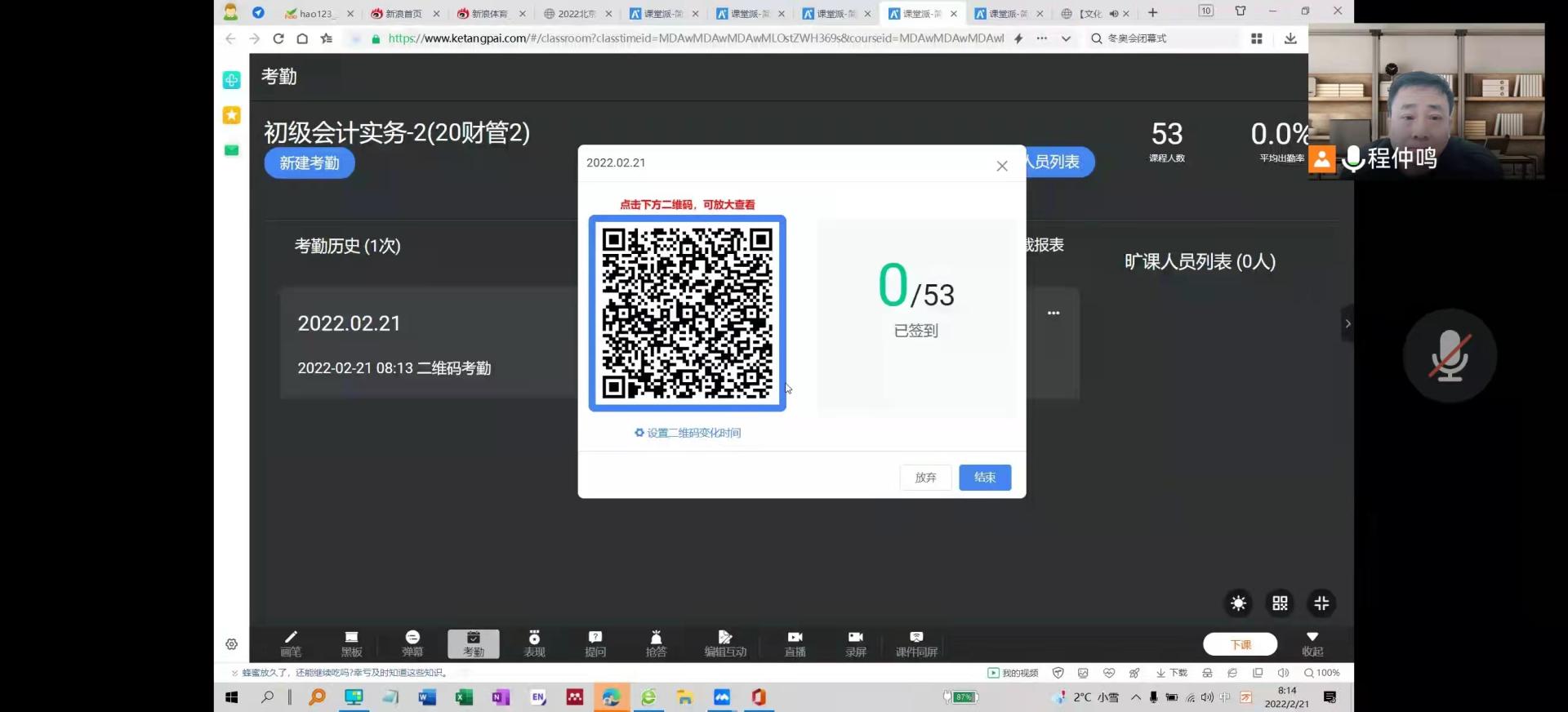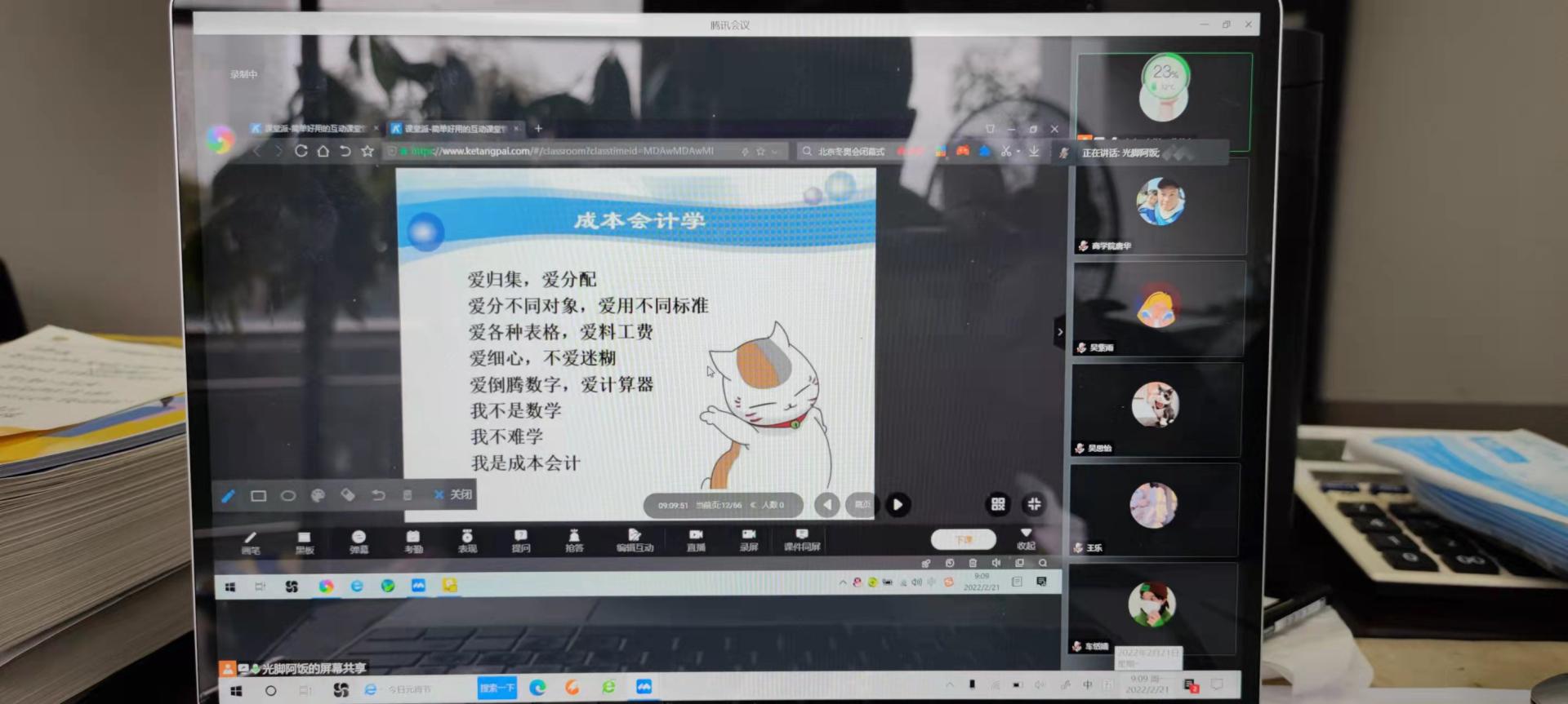 程仲鸣老师早早来到《初级会计资格概论》线上课堂,做好线上授课的各种准备,课堂派的配合使用,课前的考勤签到等,8:20正式上课前,52名学生全到,一切准备就绪后开始上新课。新学期新课程,程老师寄语同学们,虎虎生威,学业进步。程老师授课准备充分,情绪充沛,线上工具使用娴熟,首先介绍了课程概要,本学期授课的章节安排,会计资格证的考试注意事项等,融入的思政元素丰富,向同学们介绍了2022年的全国毕业生情况与就业形势,希望同学们正确对待会计资格证的考试,并用“专业的逻辑”能力来解决问题,然后通过题型具体分析带领同学们进入会计资格概论的环境中,课堂设置了诸多问题,师生互动好,实属一门金课。