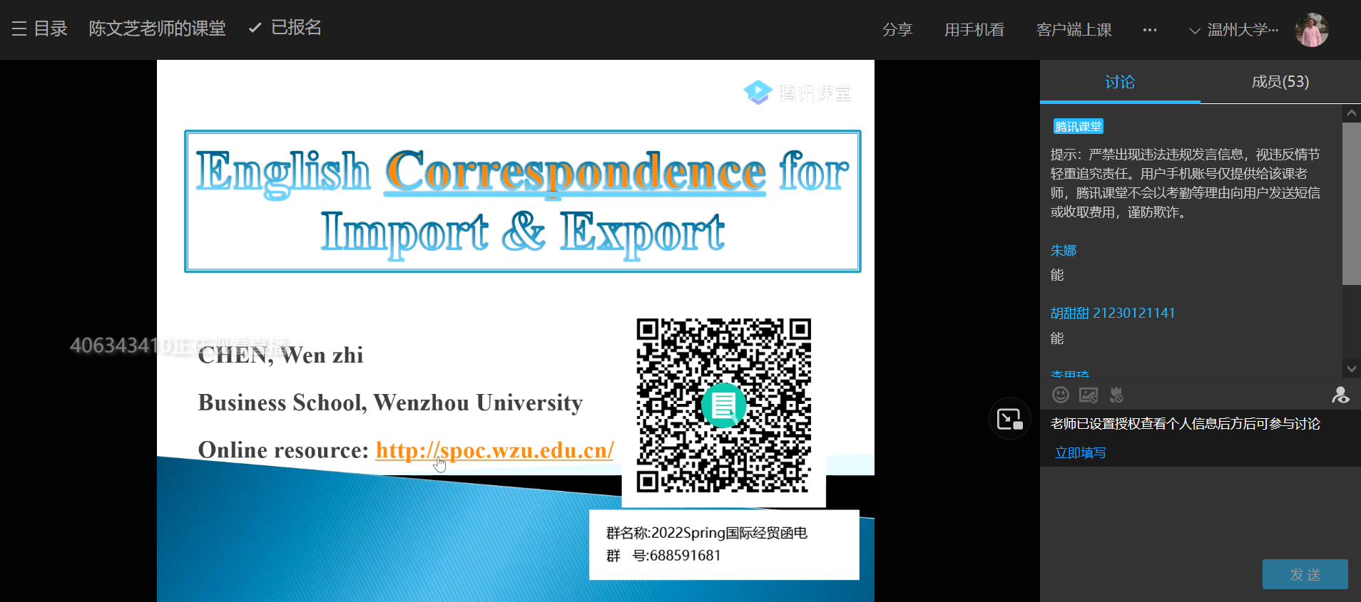 陈文芝老师线上授课采用QQ群集中链接到腾讯课堂的形式,开学第一节课提前23分钟引导学生进入腾讯课堂软件进行调试。到点后,陈老师开始介绍《国际经贸函电》的主要内容、授课形式和考核标准等,特别使用了软件自带的小插件进行课堂互动,比如调查了这门双语课两种语言使用的意向比例等,活跃了线上课堂安静的气氛,同时流利的英语口语讲课展示了教师高素养和课程的国际化氛围,讲课内容图文并茂,引用了自己访学美国的一些经历和文件。学生用显示窗和线上发言等形式进行了互动,线上督导们对陈文芝老师的课程评价也很高。