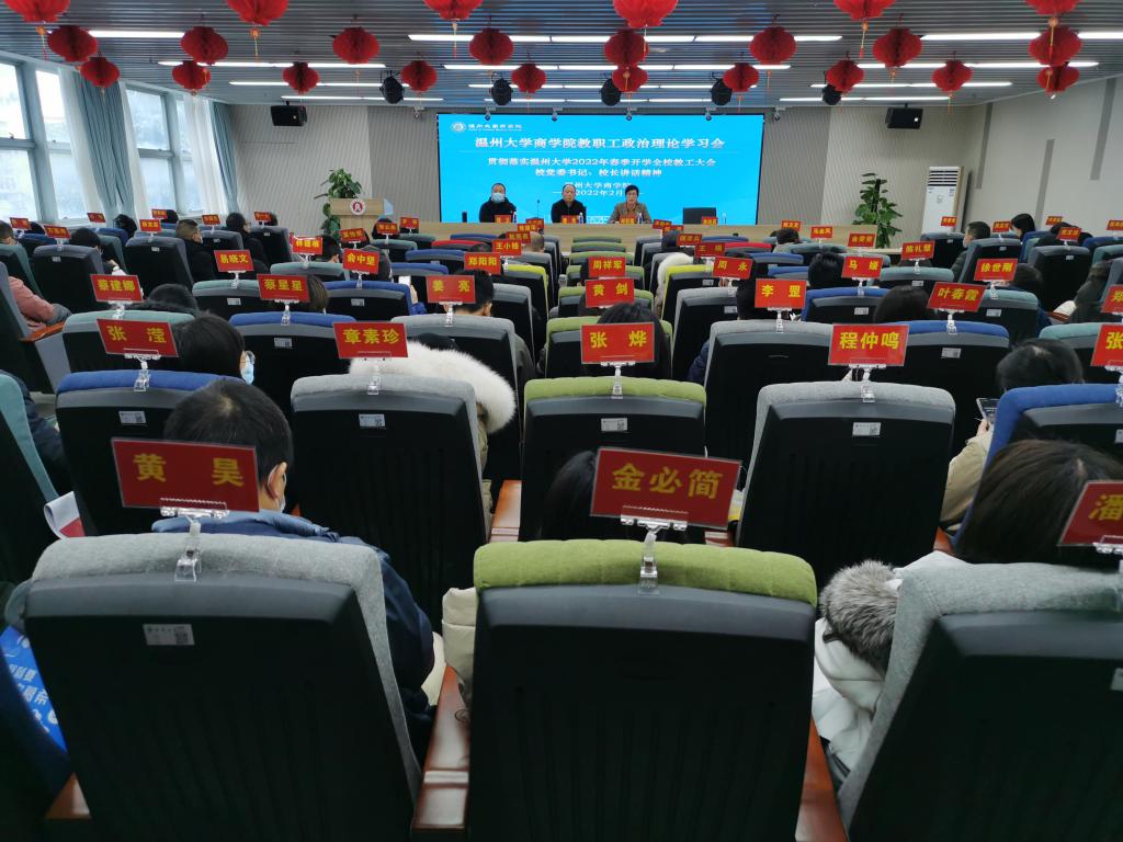 2022年2月23日下午,免费黄色网站在商院楼A226仲辉商道讲堂举行2022年春季新学期教职工理论学习大会,切实提高政治站位,认真贯彻落实谢树华书记、赵敏校长在2022年春季新学期全体教职工大会上的讲话精神。全体教职工参加学习会,会议由学院党委书记郑彩莲主持。