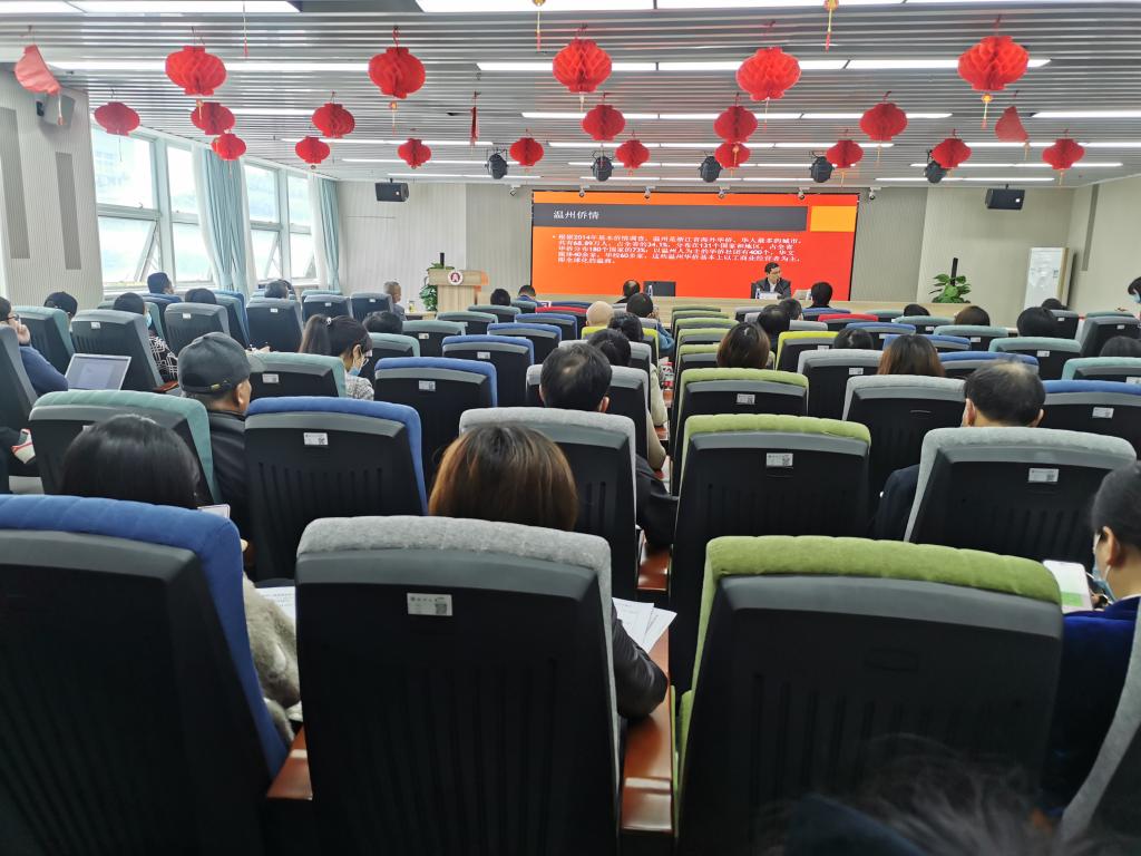 2022年3月30日下午,商道讲坛第十四讲在北校免费黄色网站A226仲辉商道讲堂开讲。厦门大学经济学博士、温州市世界温州人研究中心秘书长张一力教授带来“如何利用和对接涉侨研究资源”的专题报告,免费黄色网站全体教职工现场聆听报告,现场座无虚席。