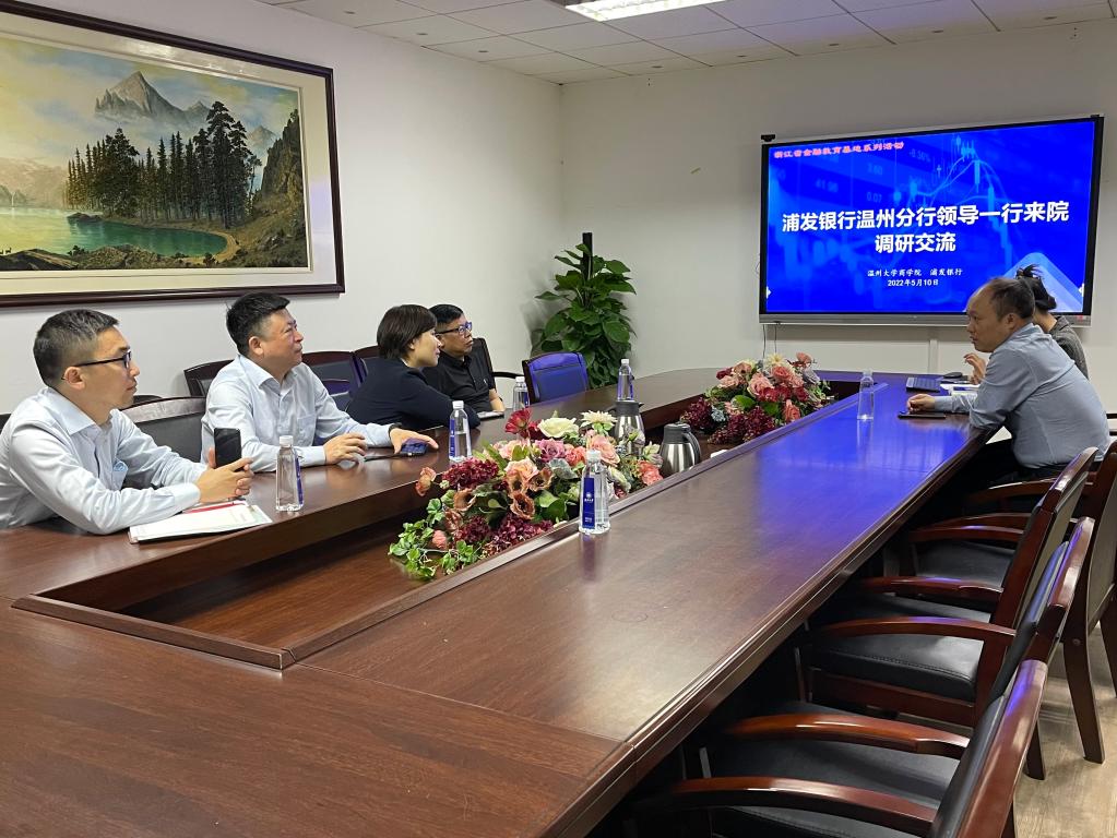 2022年5月10日下午,浦发银行温州分行办公室兼资金财务部经理方珏、温州理工学院经管分院蒲祖生老师等一行来我院调研交流。免费黄色网站党委副书记唐华、党务秘书聂海燕参加座谈交流,双方围绕金融教育基地申报、活动筹备、联合宣传等问题展开深入讨论。