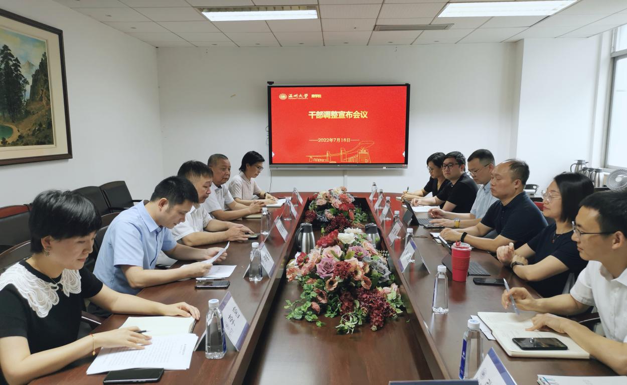 2022年7月18日上午,免费黄色网站在信息楼A222会议室举行干部调整宣布会,温州大学校长赵敏出席会议并讲话,免费黄色网站院长胡振华主持会议,组织部相关同志、免费黄色网站全体领导班子及科级以上干部参加会议。