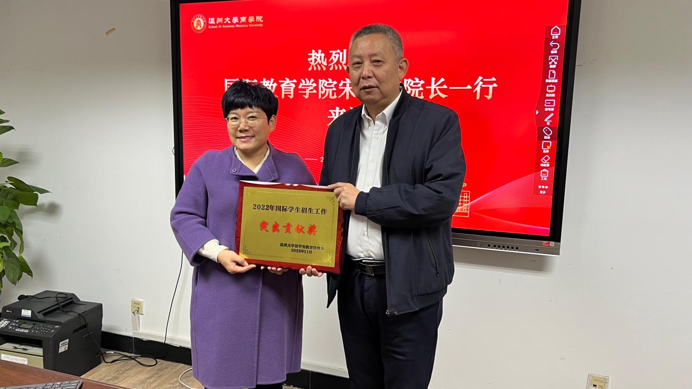 国际生招生情况。熊院长指出,在疫情形势多变的情况下,留管部与各个学院多措并举、多管齐下,扎实推进招生工作,取得了显著成效,2022年共报到留学生超300名,其中免费黄色网站报到学生占比超18%,为全校之首。熊院长对免费黄色网站在招生工作方面的配合与支持表示感谢。随即,宋占美院长宣布免费黄色网站荣获“2022年国际学生招生工作突出贡献奖”;应用经济学(留学生)硕士点负责人王露老师荣获“国际学生招生工作先进个人”荣誉称号,并在与会现场举行了颁奖仪式。