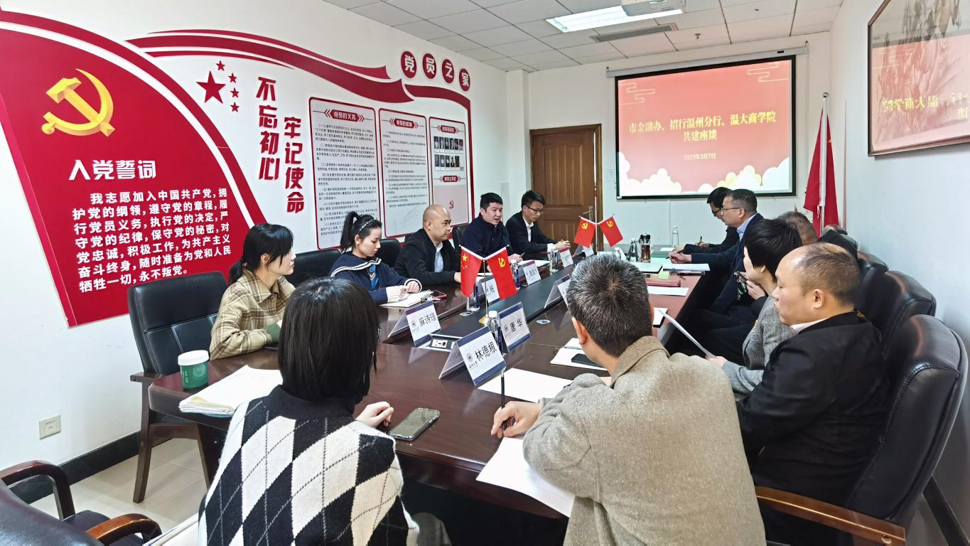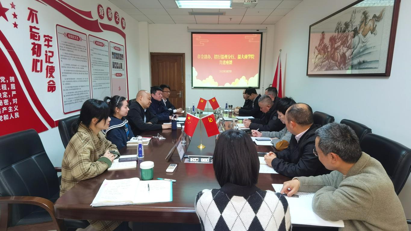 2023年3月7日上午,温州市金融办金融稳定处处长詹昌为等一行2人、招商银行温州分行零售金融事业部总经理刘斯时等一行3人来我院调研交流。免费黄色网站院长胡振华、党委书记李密、金融系教师代表等参加座谈交流活动。双方围绕“银校共建”主题进行了深入会谈。会议由唐华副书记主持。