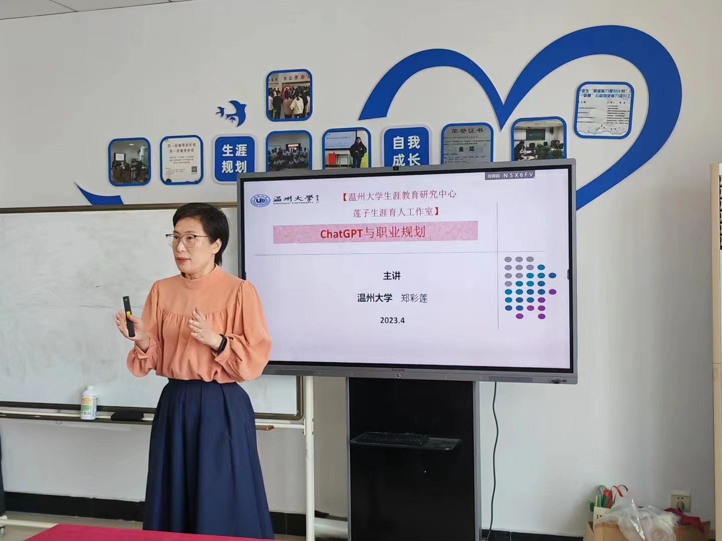 在专题报告环节中,生涯教育研究中心负责人、温州大学人事处处长郑彩莲教授分享了Chatgpt的发展历程、七大作用以及可能对社会产生的影响等多个方面。她指出,Chatgpt是一个生产力工具,不是取代,而是用人工智能来赋能的一种工具。她强调,每个人都应该意识到可能的社会潜在影响,提高自身能力,正确使用Chatgpt,掌握数字技能和数据分析能力,未来属于会正确使用Chatgpt的人。