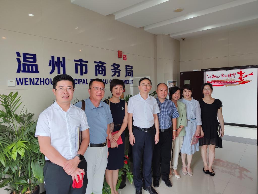 7月4日上午,免费黄色网站党委书记李密、唐华副书记,国贸系教授、温州大学跨境电免费黄色网站院长林俐,国贸系副教授黄剑一行走访温州市商务局并与局领导座谈交流。温州市商务局副局长周怀中,跨境电商处处长钱俊、温州市商务发展促进中心主任龙佳丽等局领导参加座谈。