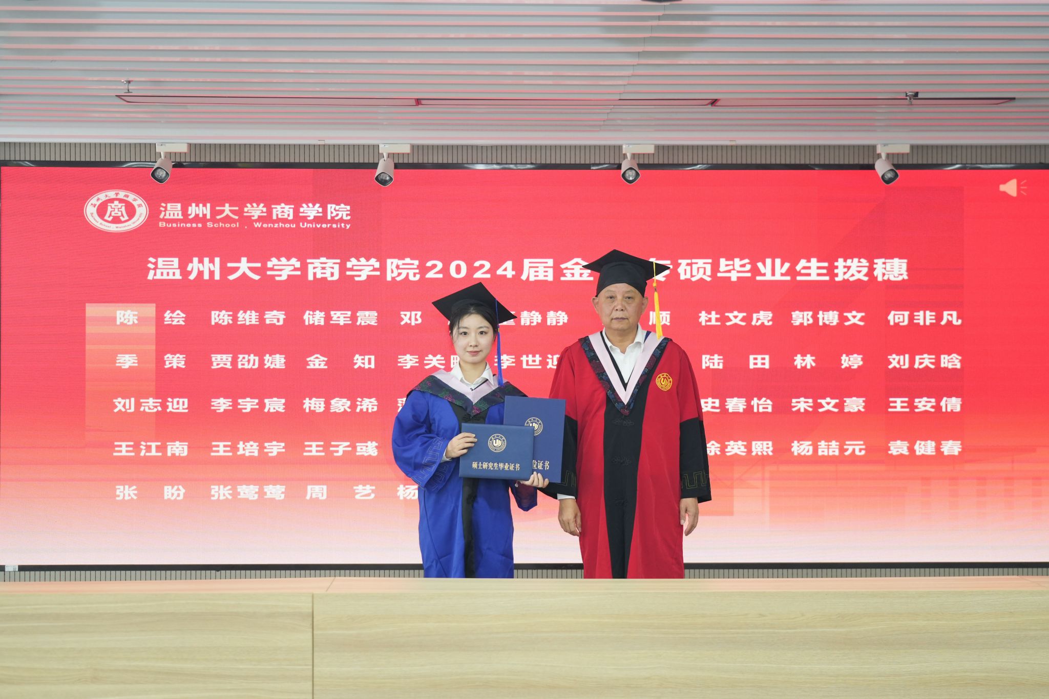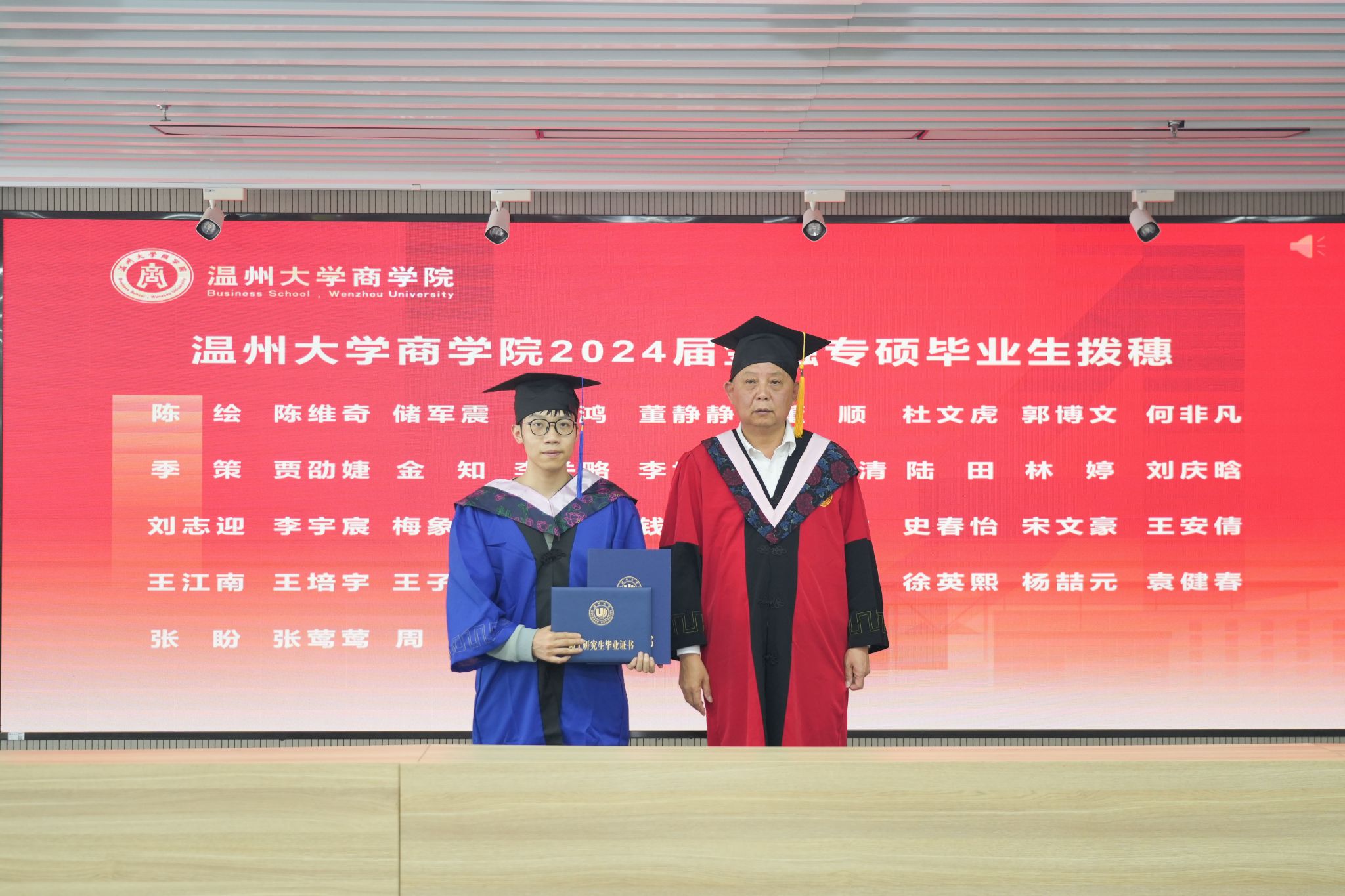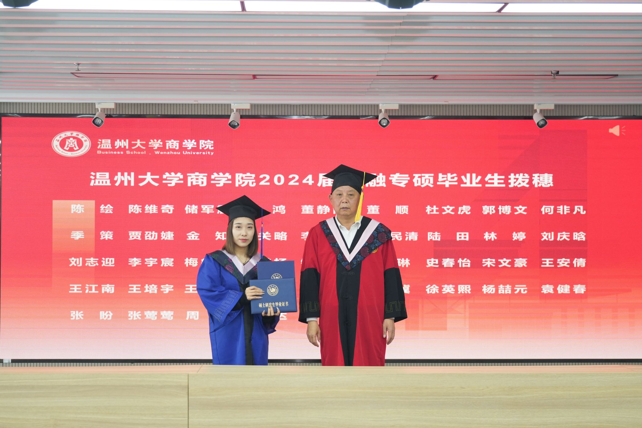 拨穗象征着成熟,代表着毕业生们硕果累累、学有所成。胡振华院长为每一位毕业生颁发毕业证书、学位证书、拨穗,并合影留念。