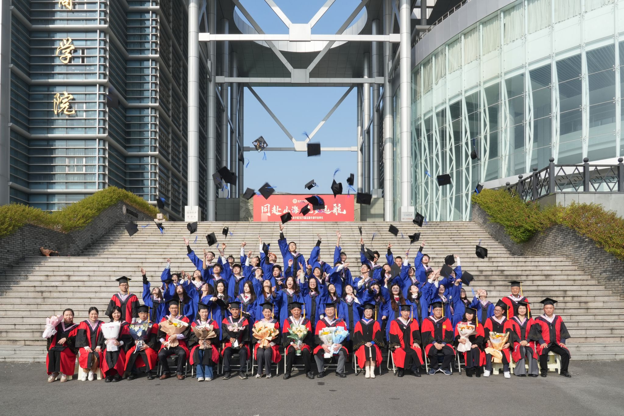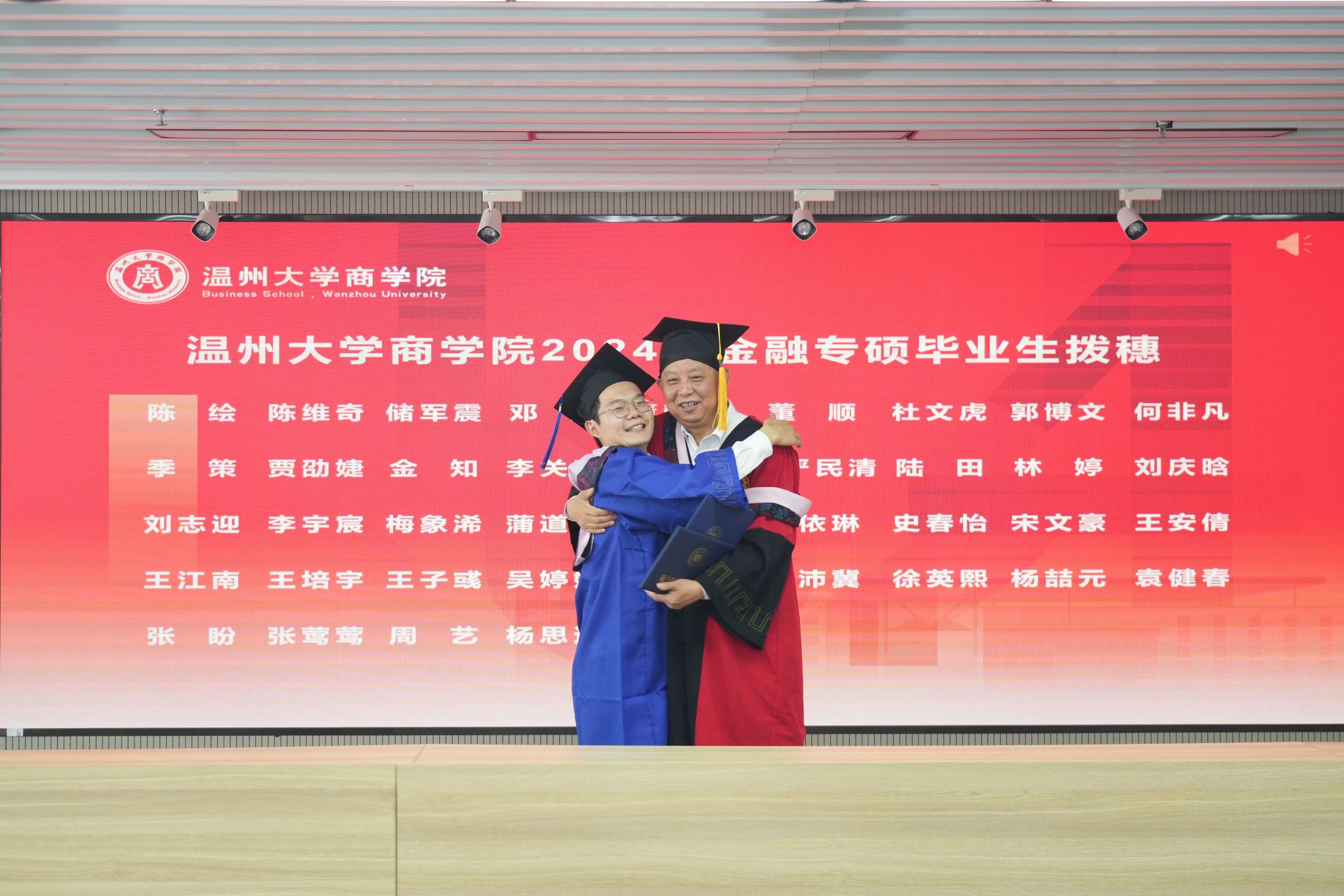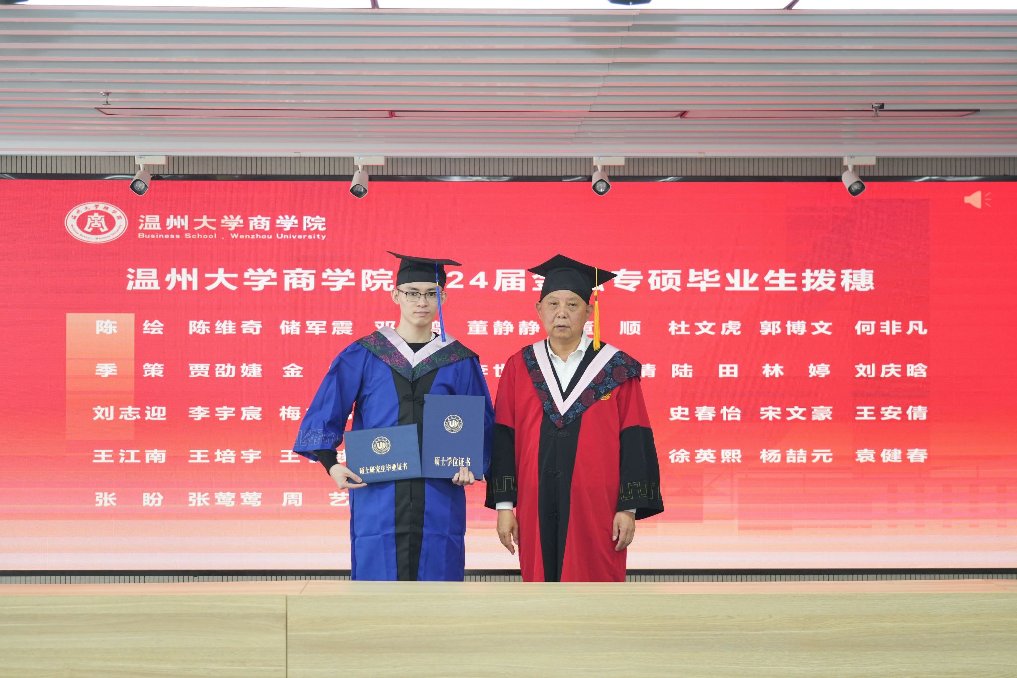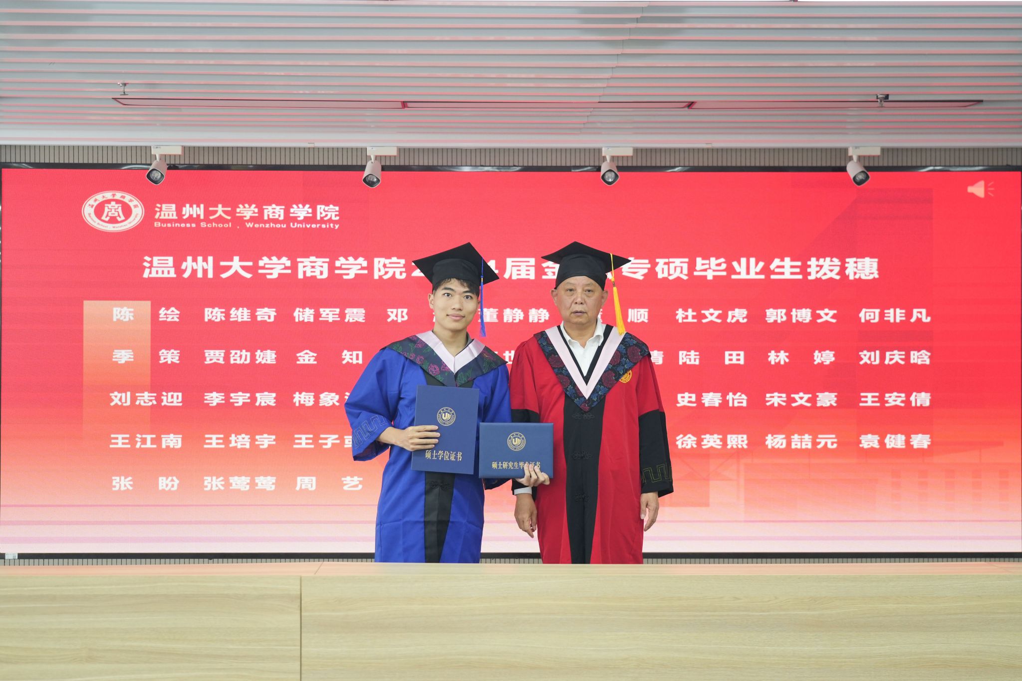 拨穗象征着成熟,代表着毕业生们硕果累累、学有所成。胡振华院长为每一位毕业生颁发毕业证书、学位证书、拨穗,并合影留念。