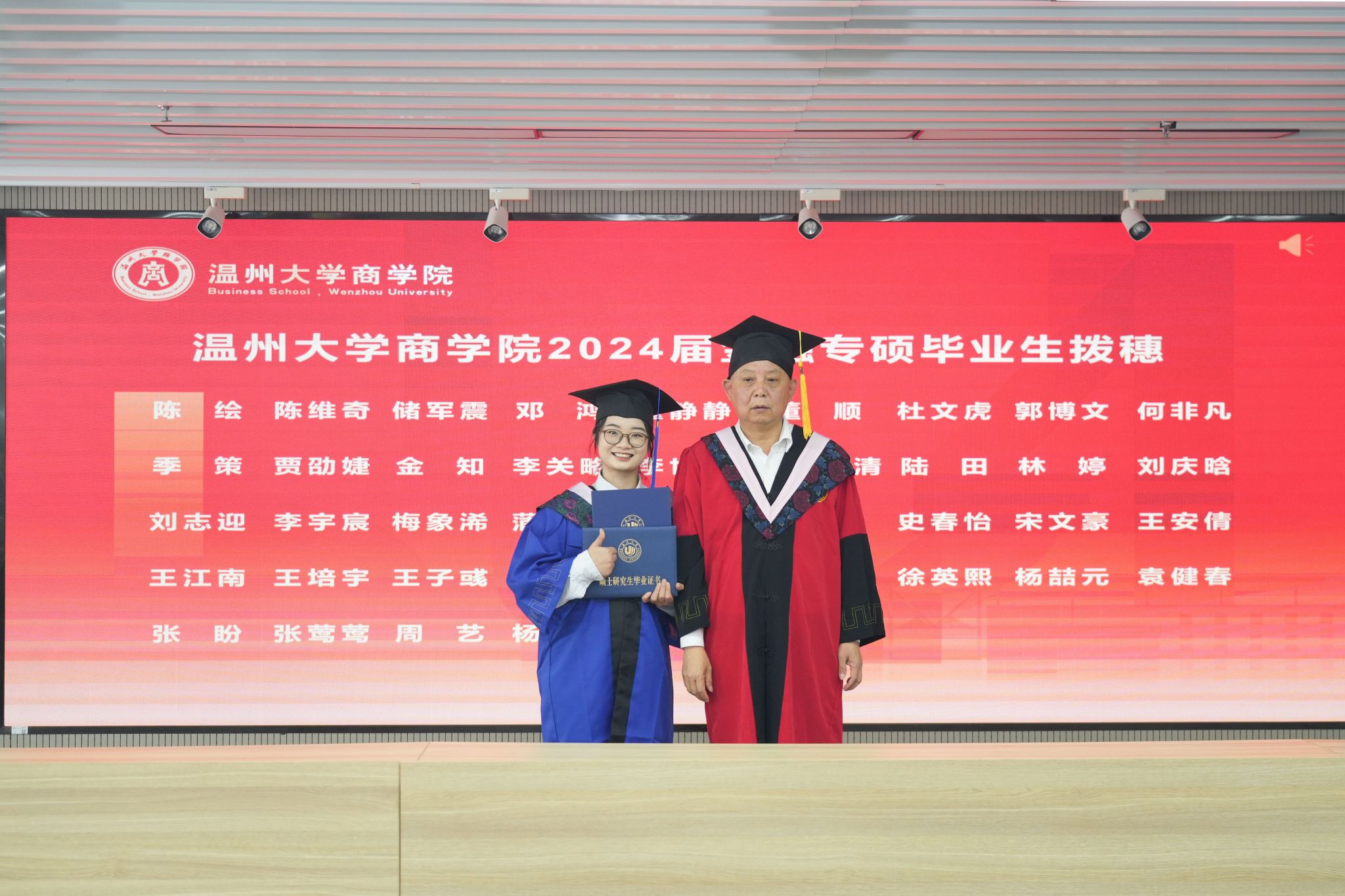 21级金融专硕刘志迎同学作为毕业生代表发言。她感谢温州大学提供的优越求知平台和学习环境,免费开放大量的讲座和优秀的公开课,还有大师级别的老师传道授业解惑。老师们深入浅出的讲解,让学生们更加深刻的理解学术的精髓,同时学院还聘任行业大佬担任同学们的校外导师,为学生提供实习机会,分享行业经验。最后,她再次感谢学院老师们这两年多的悉心教导和精心栽培,感谢同学们给予的陪伴和支持。在未来的日子里,她祝愿各位老师硕果累累,桃李芬芬,祝愿温大蒸蒸日上,祝愿同学们前程似锦。