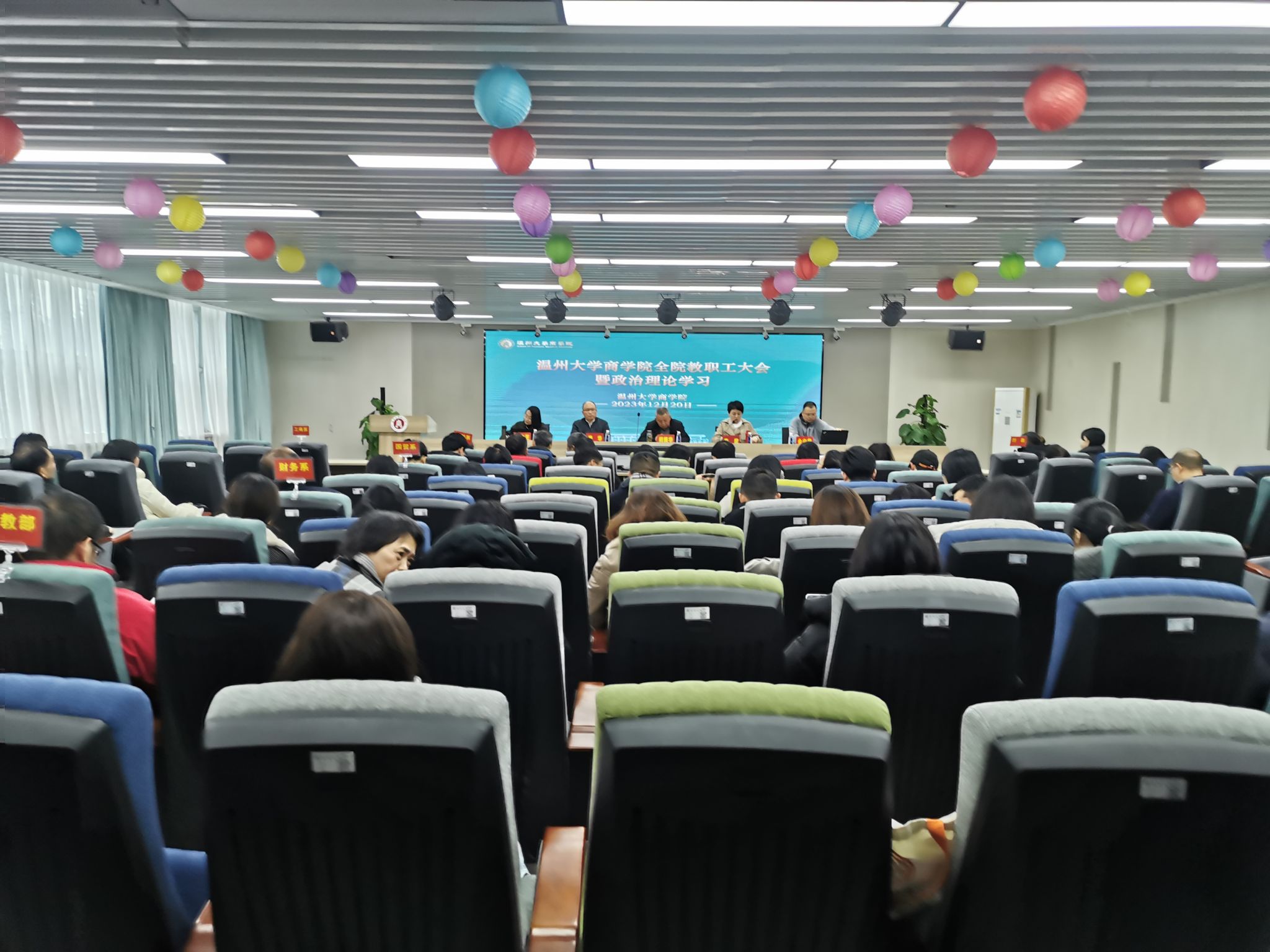2023年12月20日,免费黄色网站在仲辉商道讲堂举行全院政治理论学习暨主题教育调研报告成果交流会,全体教职工参加会议,会议由学院党委书记李密主持。