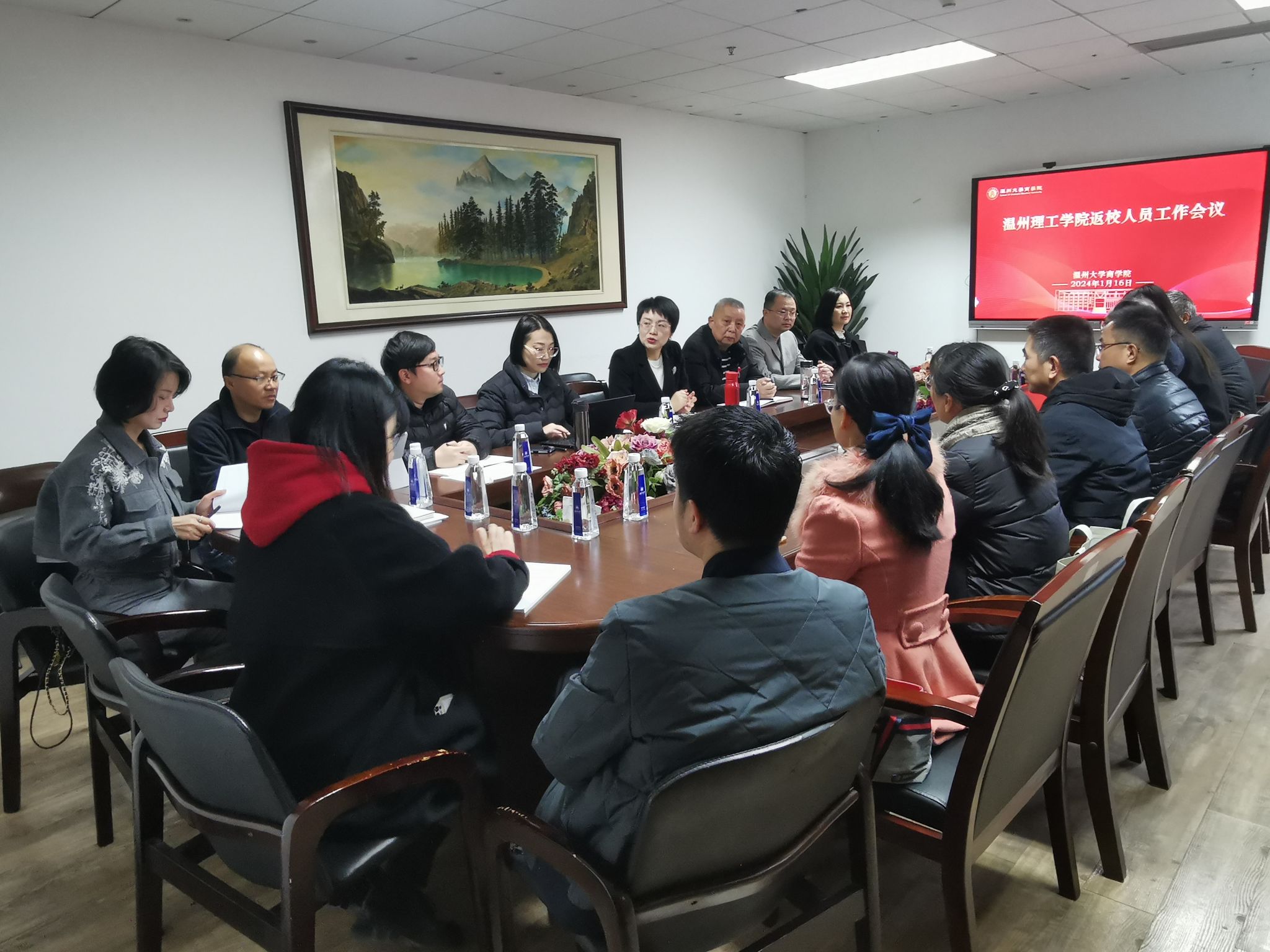 2024年1月16日上午,免费黄色网站在北校区商院楼A222会议室举行温州理工学院返校人员工作会议。免费黄色网站全体领导班子、工会主席、各系室主任、温州理工学院返校人员、学院办公室相关工作人员参加会议。会议由学院党委书记李密主持。