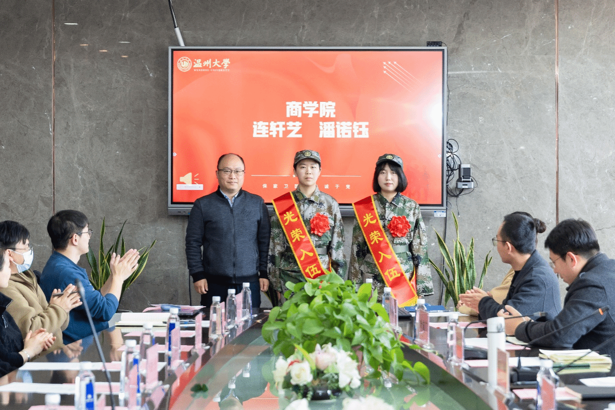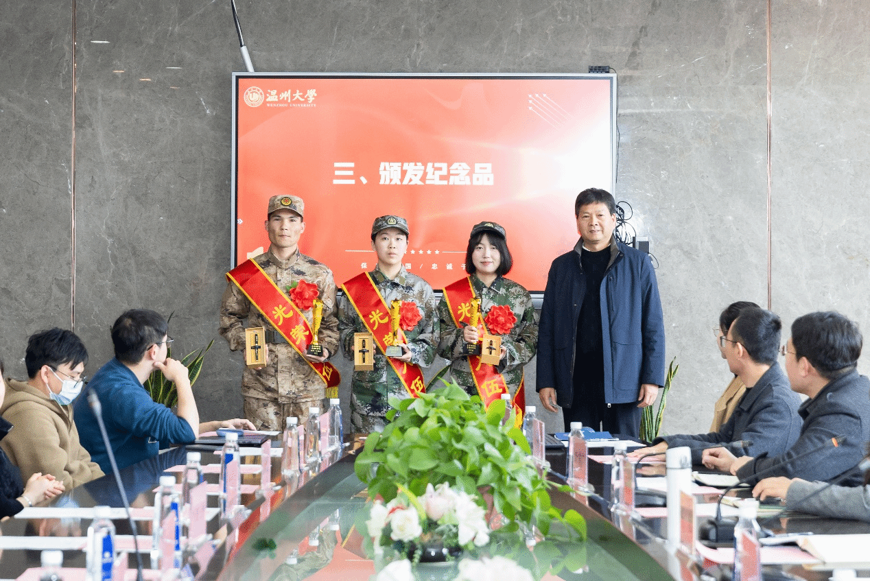 欢送会最后,温州大学党委副书记庄兴忠为两位同学颁发了入伍纪念品,免费黄色网站党委副书记唐华为两位同学佩戴绶带和大红花,并合影留念。