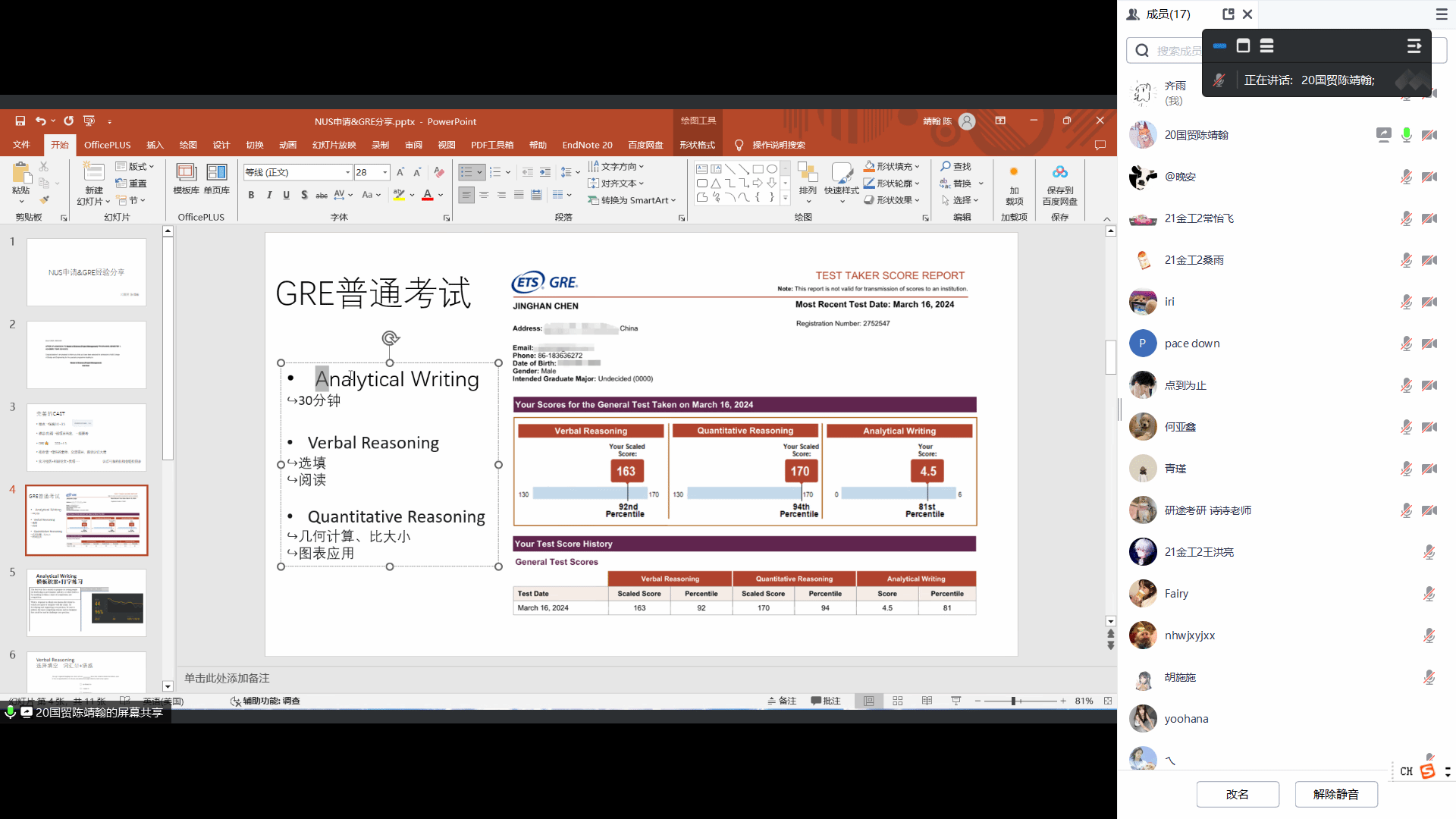 分享会伊始,免费黄色网站学生辅导员胡施施老师首先介绍了本次活动的目的和意义,并鼓励大家积极参与互动,向今年刚上岸的学长学姐们请教问题。随后,22工商(专升本)单林峰同学基于自身经历,提醒学弟学妹们选择大于努力,择校非常重要;22国贸(专升本)2杨思思同学认为“种一棵树最好的时间是在十年前,其次是现在”,详细地分享了备考期间每个时间段需要做的事;20工商许玉婷同学从个人经验出发,分享了自己择校和择专业的心路历程;20金融工程1林臻宇同学从择校、政治、英语二、369和431五个方面进行了详细讲解,并表达对学弟学妹们的鼓励;20财务1李亚恬同学介绍了近年来管理类的考情,向学弟学妹们分享了管综复习的规划;20国贸陈靖翰同学则是分享了NUS申请和GRE经验,从备考计划、资料选择、时间管理、答题技巧等方面进行了详细讲解,为学弟学妹们提供了宝贵的参考。