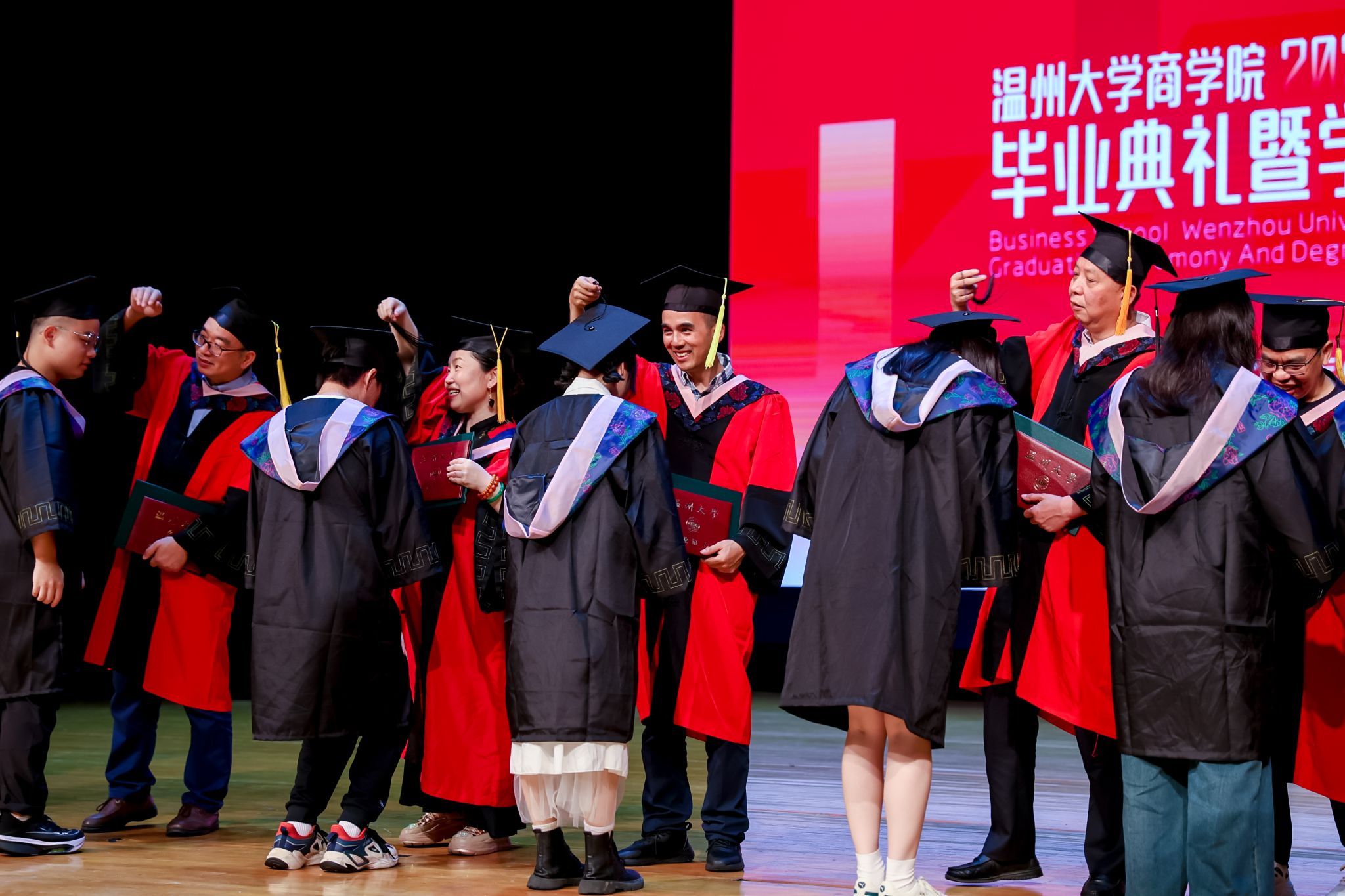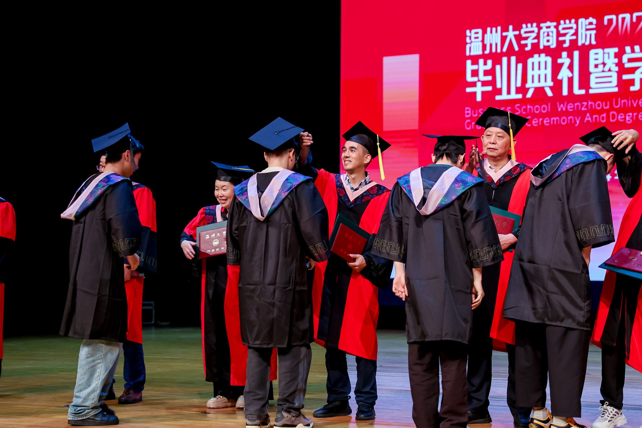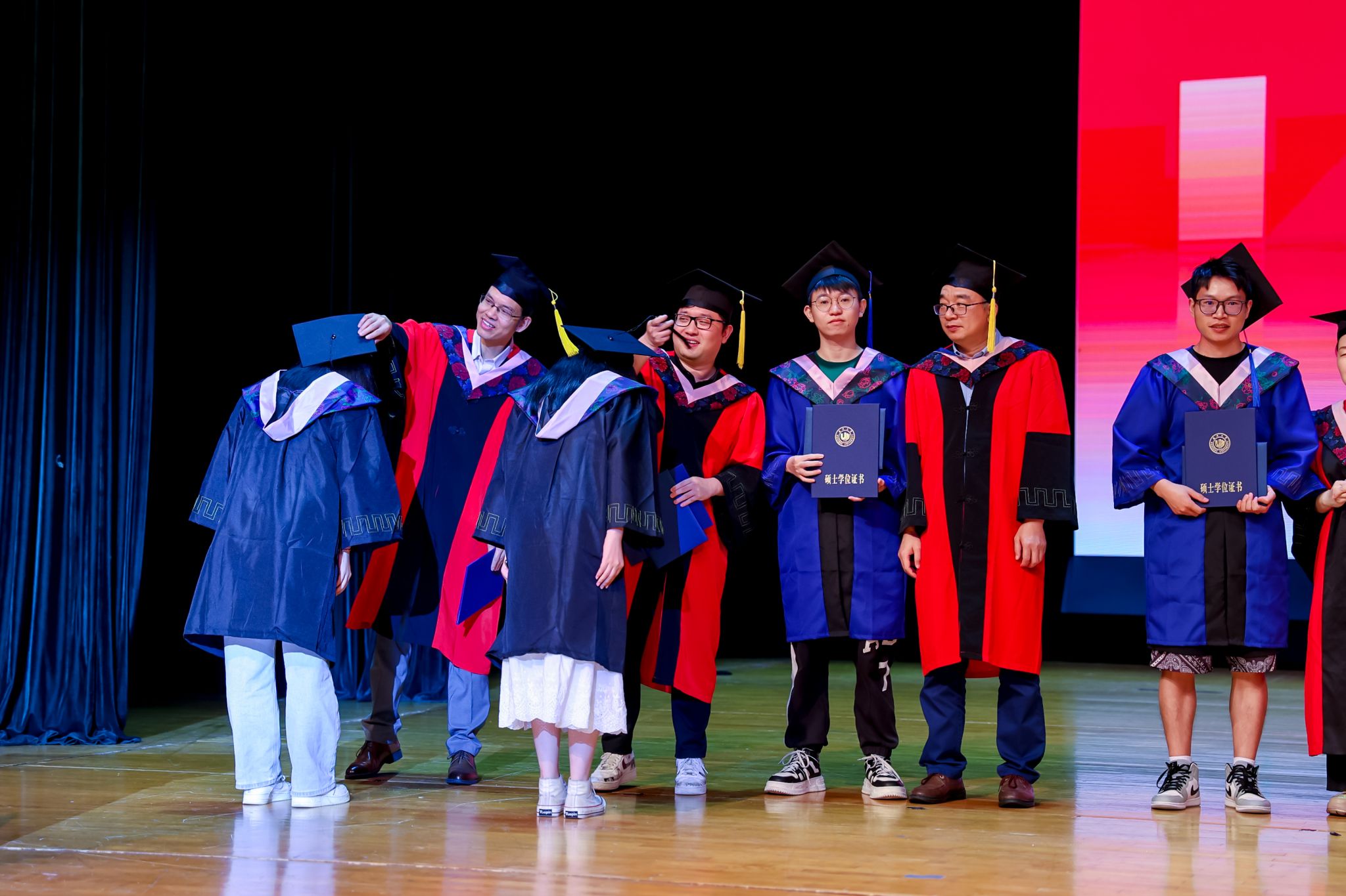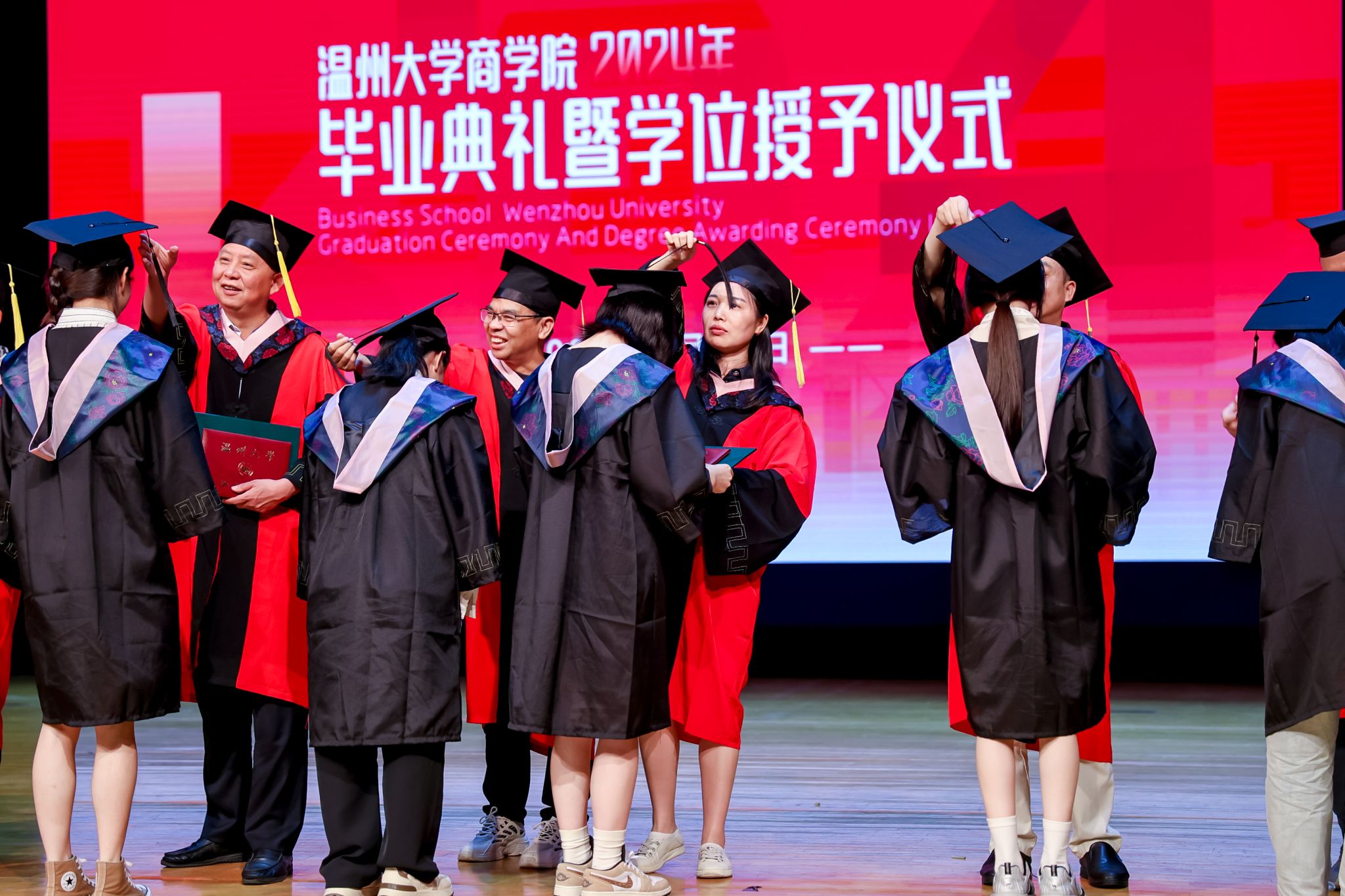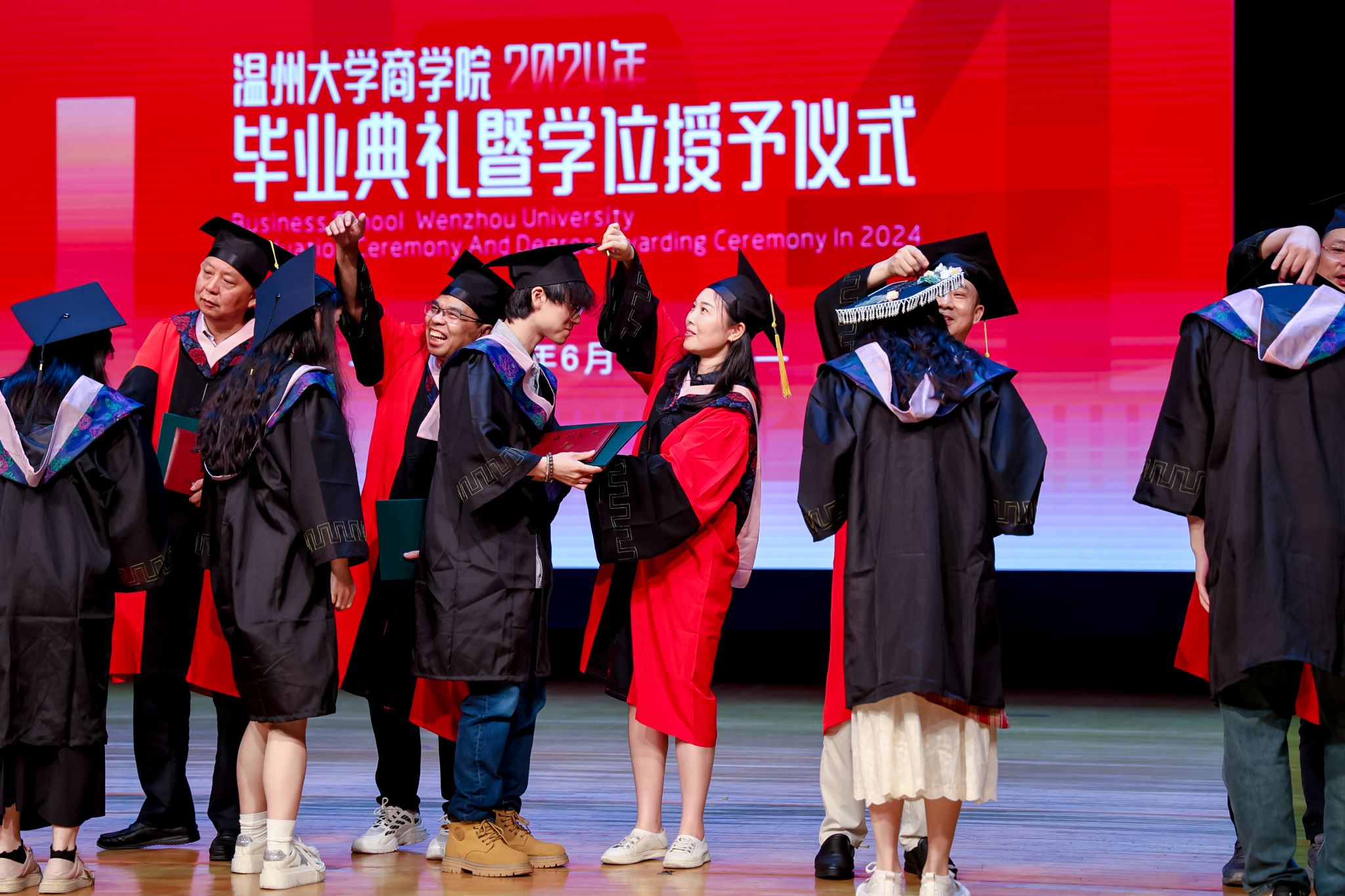 毕业典礼上,免费黄色网站学术委员会的教授代表们依次走上台前,为每一位毕业生庄重地拨穗,亲手颁发毕业证书和学位证书,随后与毕业生们共同合影留念,以记录下这人生中意义非凡的时刻。