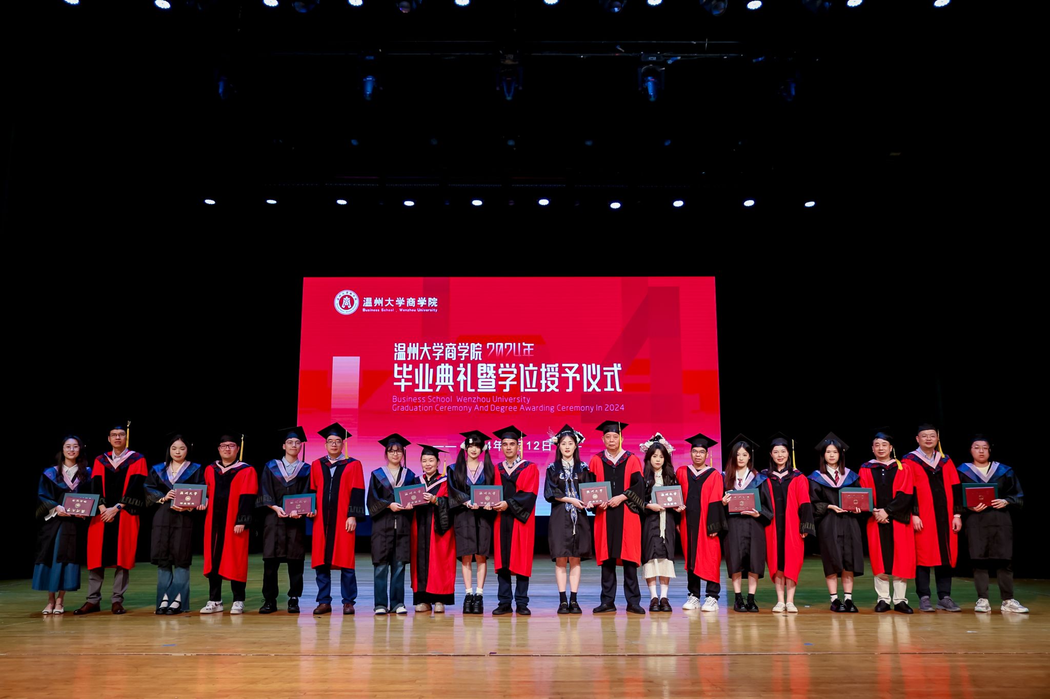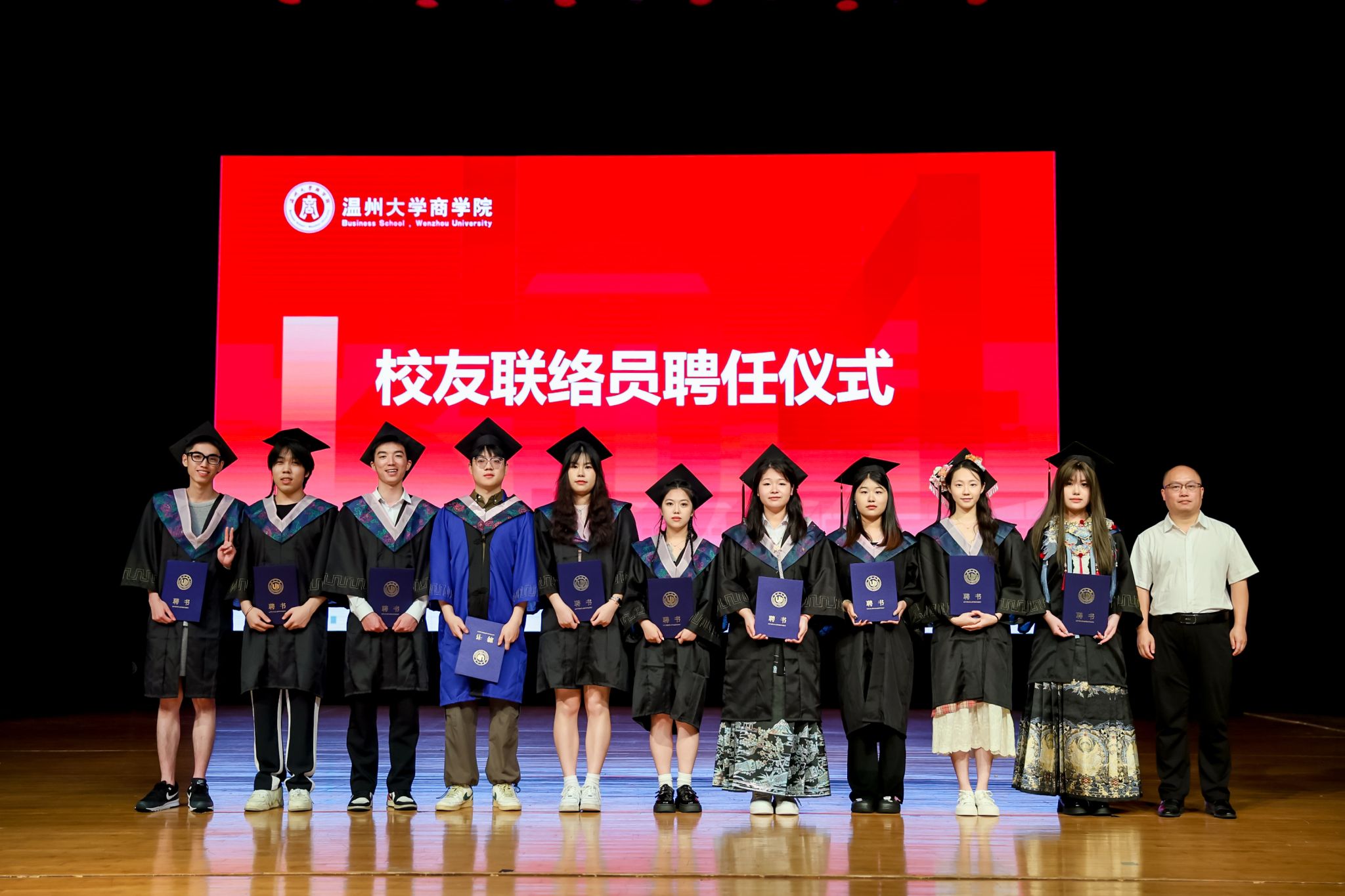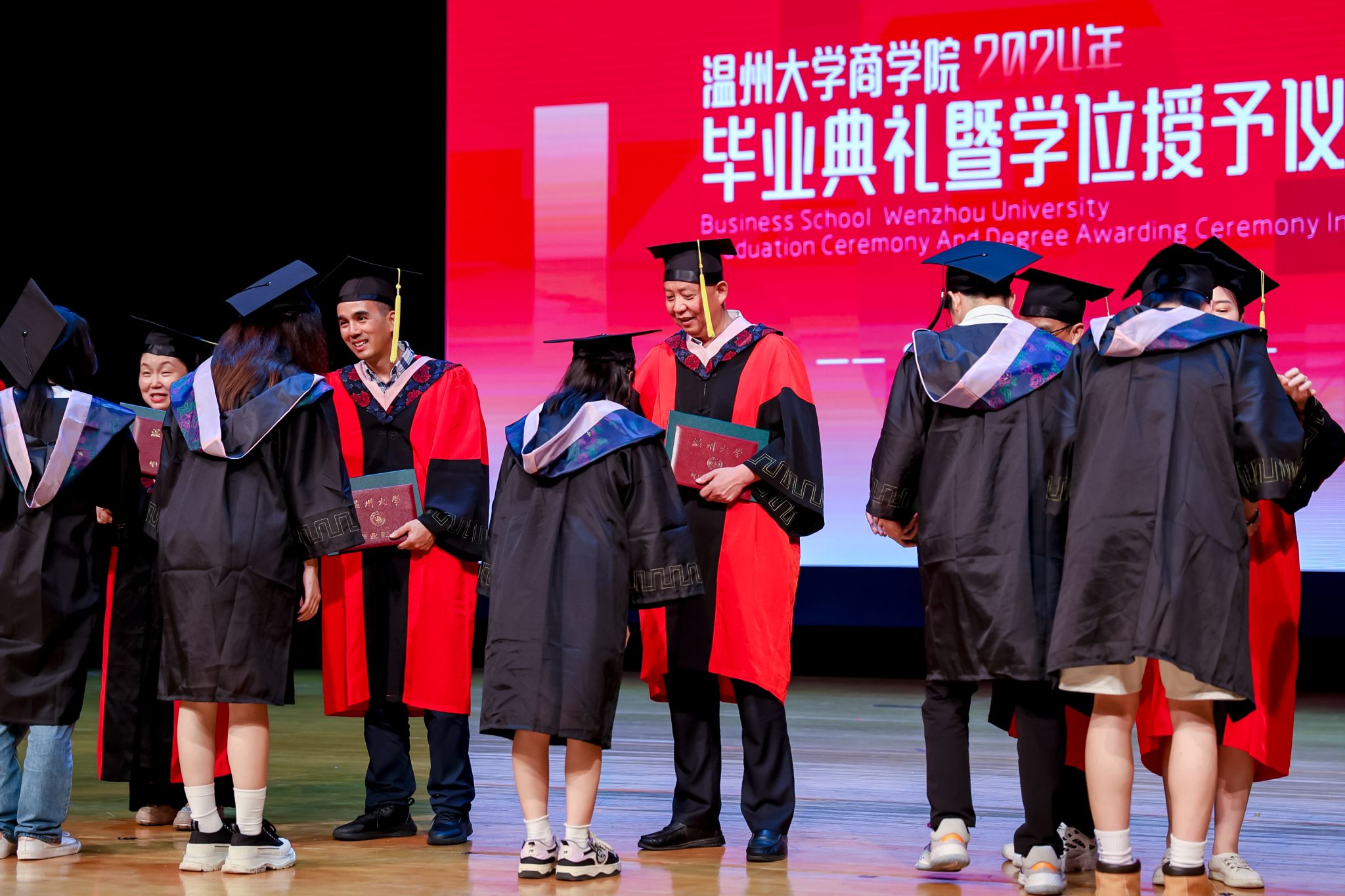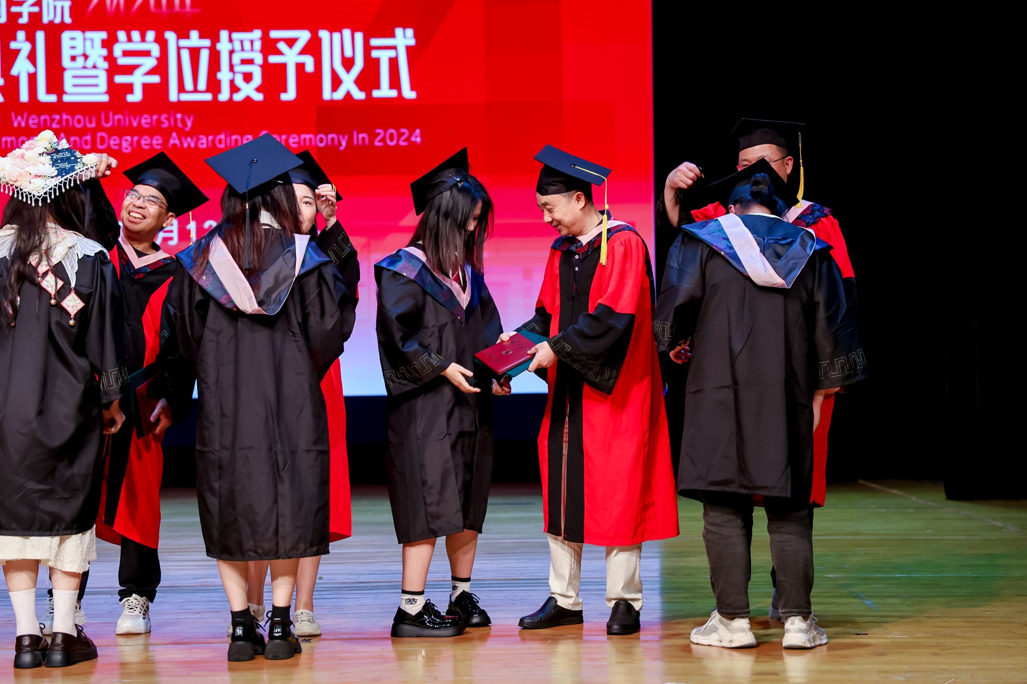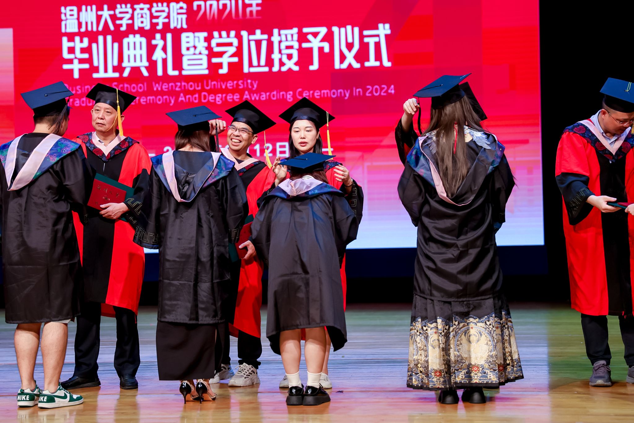 毕业典礼上,免费黄色网站学术委员会的教授代表们依次走上台前,为每一位毕业生庄重地拨穗,亲手颁发毕业证书和学位证书,随后与毕业生们共同合影留念,以记录下这人生中意义非凡的时刻。
