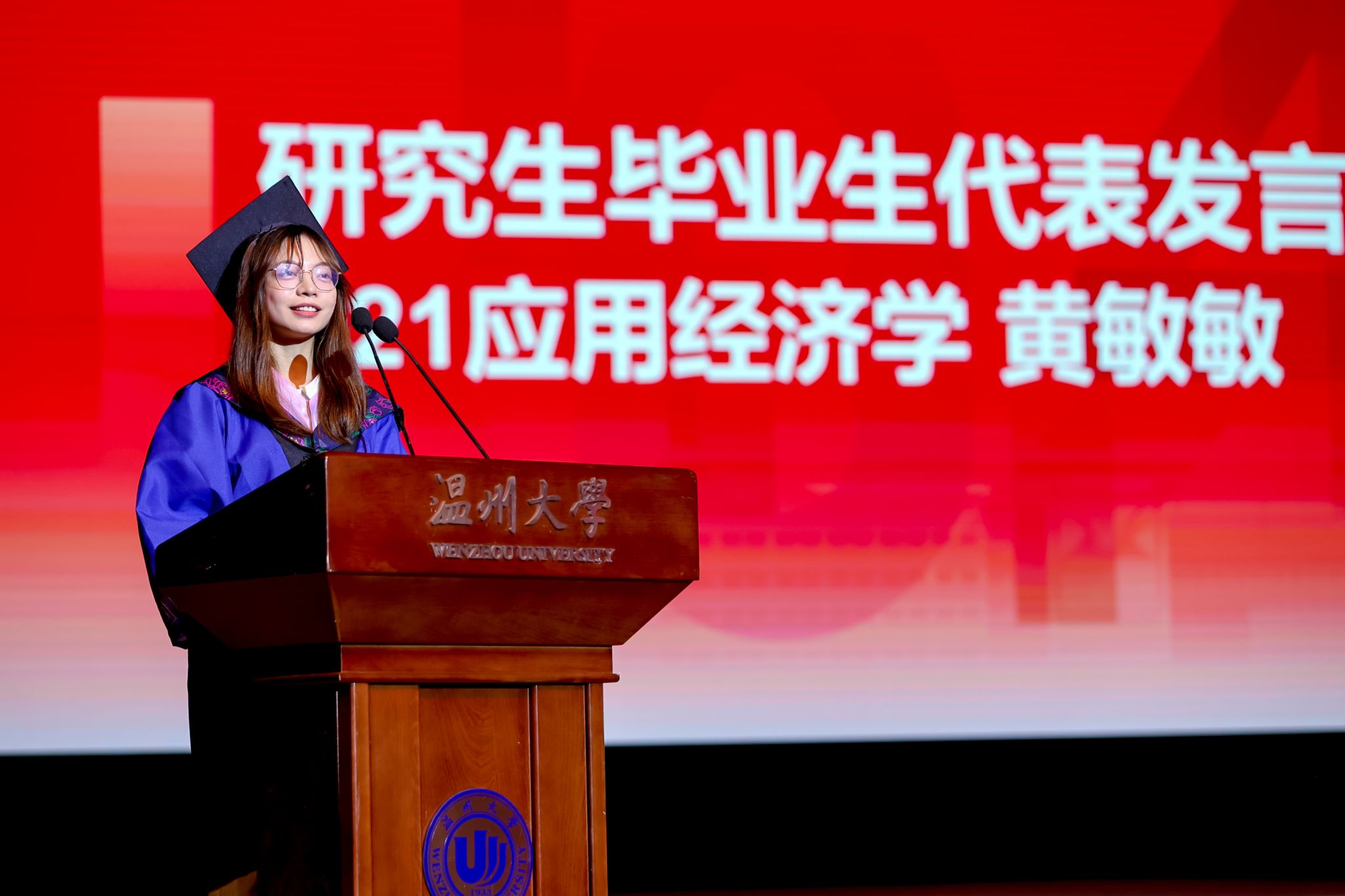 21应用经济学班黄敏敏同学作为研究生毕业生代表发言,她首先向母校、老师、同窗表达了深深的感激,并回顾了那些满载回忆的日夜,表示对校园生活的眷恋如同对青春的赞歌。经过三年的磨砺,她敢于面对挑战,勇往直前,收获了成长与智慧。饮水思源,她铭记师恩,珍视同窗情谊。未来,她将怀揣着对母校的感恩,担当起社会责任,追求理想,实现自我价值。青春如火,热烈绽放;生活如诗,前程似锦。最后,她祝愿每一位毕业生毕业快乐,且都如蔚然之树,茁壮成长。