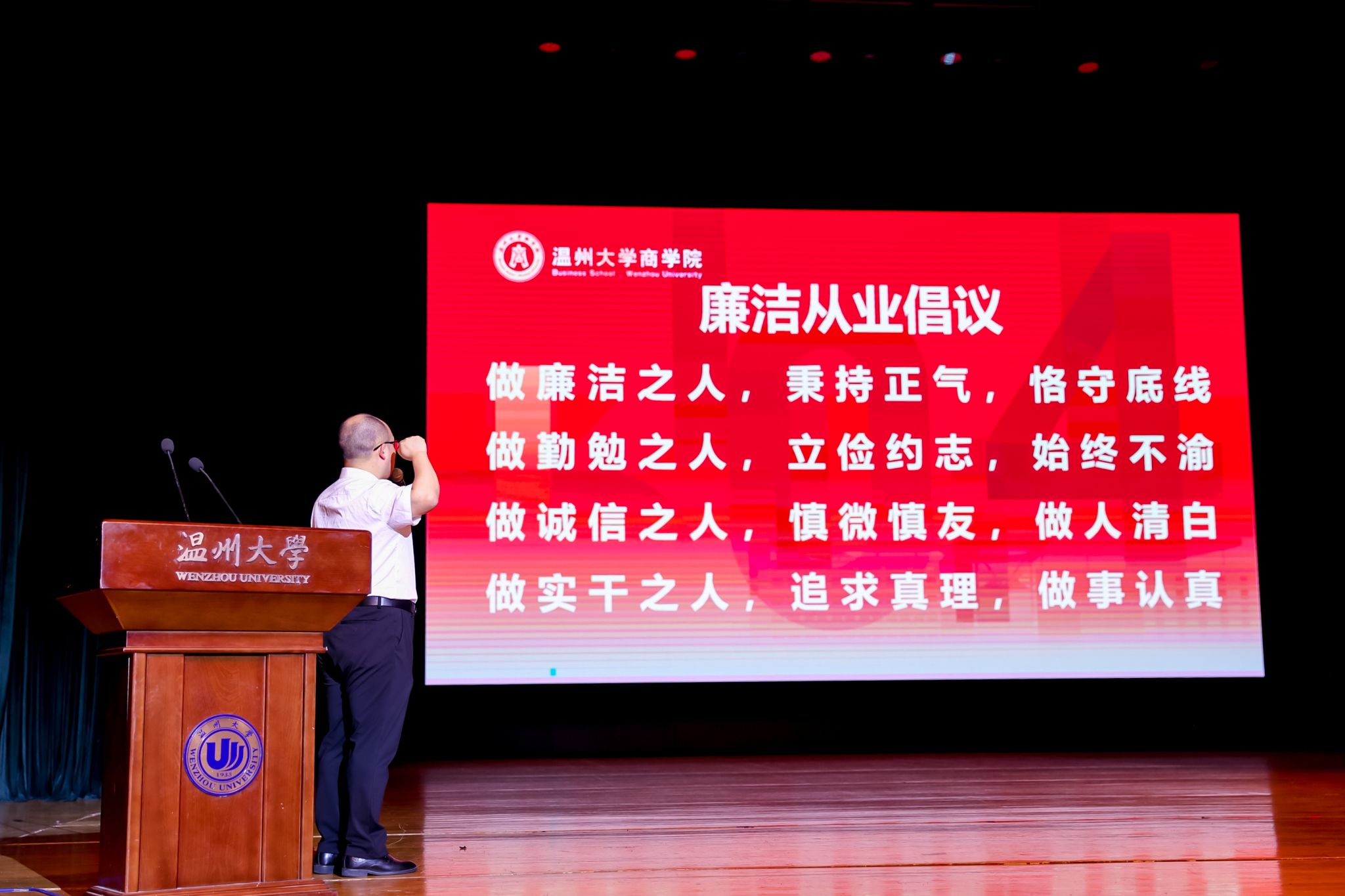 免费黄色网站作为温州市清廉金融共建基地,一直致力于培养具有高尚道德品质和职业操守的商科人才。为帮助毕业生扣好职场和人生“第一粒扣子”,学院党委书记唐华带领全体毕业生共同宣誓,承诺在未来的工作和生活中,始终坚守清廉的底线,以高尚的品格和职业操守,为社会、为免费黄色网站争光添彩。