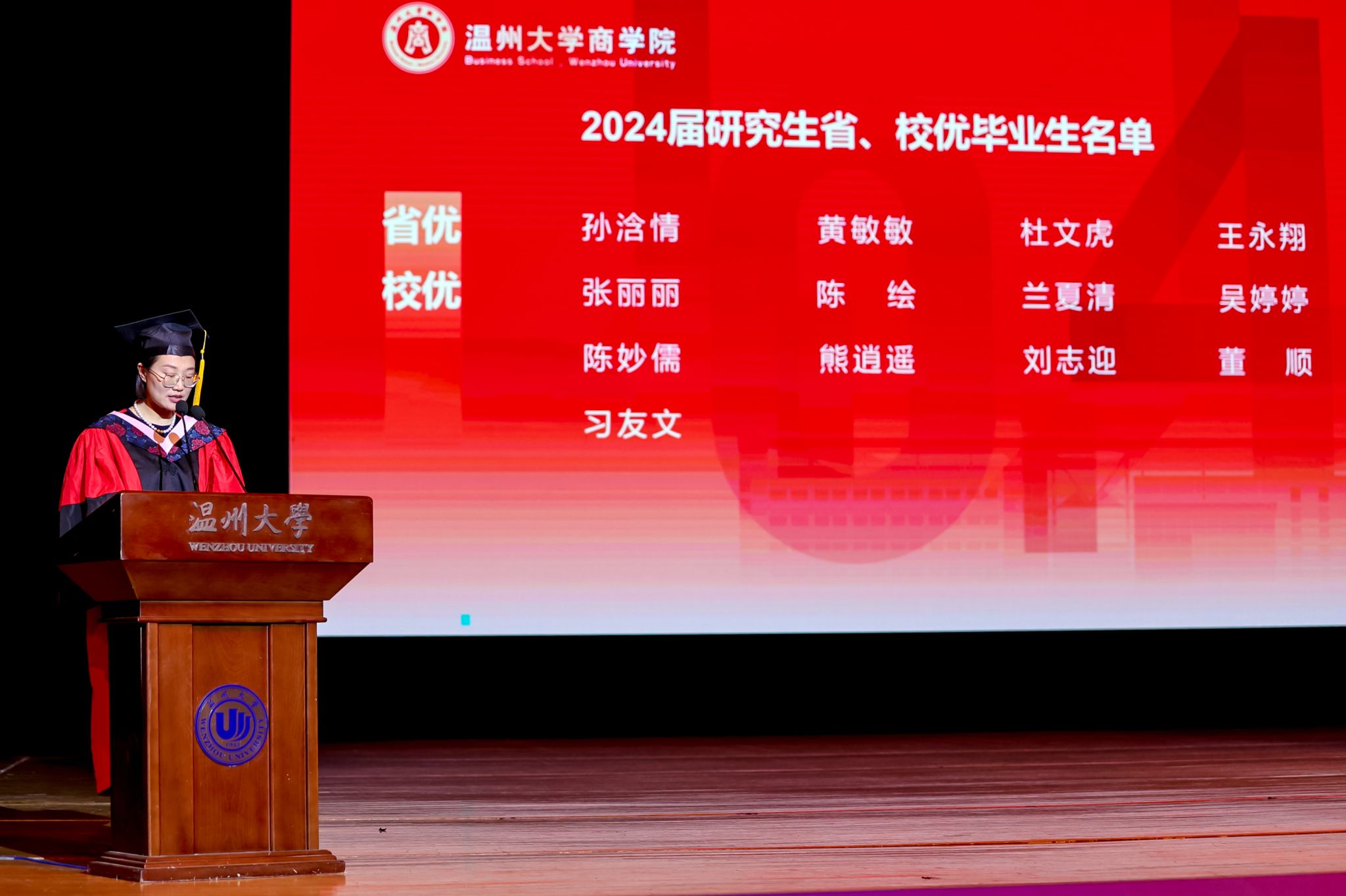 副院长陈文芝宣布2024届浙江省普通高等学校优秀毕业生及2024届温州大学优秀毕业生名单。