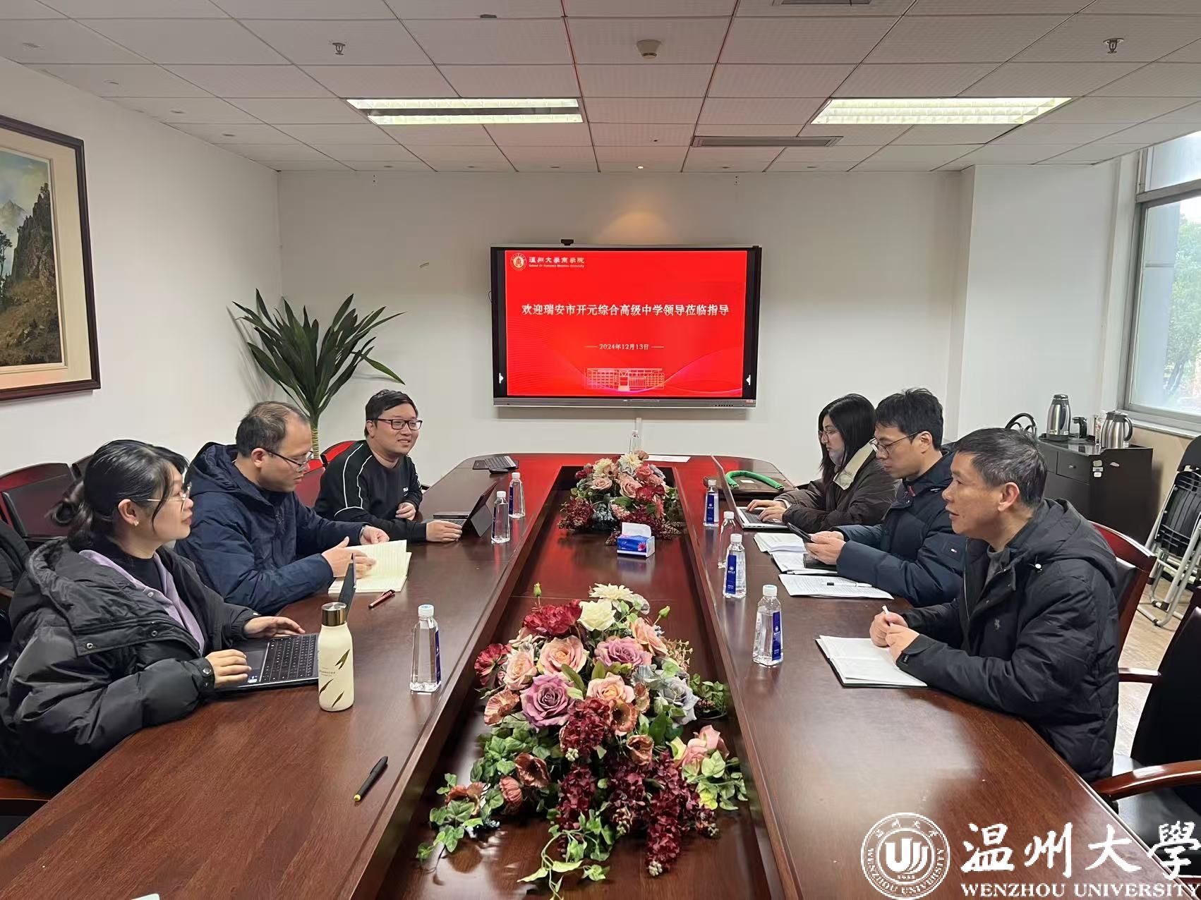 工商管理系与瑞安开元综合高级中学的领导胡希地副校长、金进旺副校长一行人就共建项目合作展开了深入且富有成效的洽谈,同时积极探讨了联合党建工作的路径,为两校的协同发展掀开了崭新的一页。