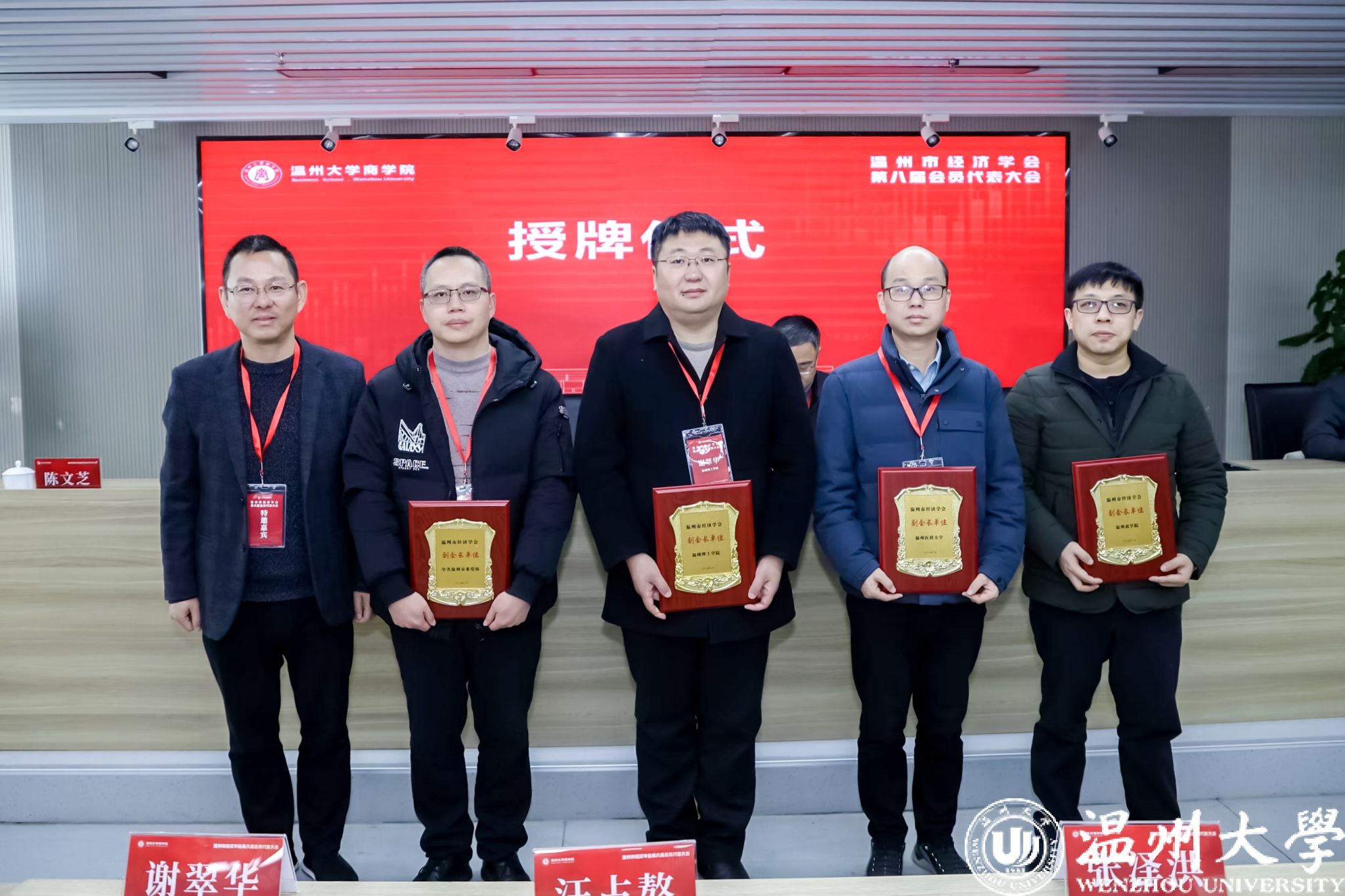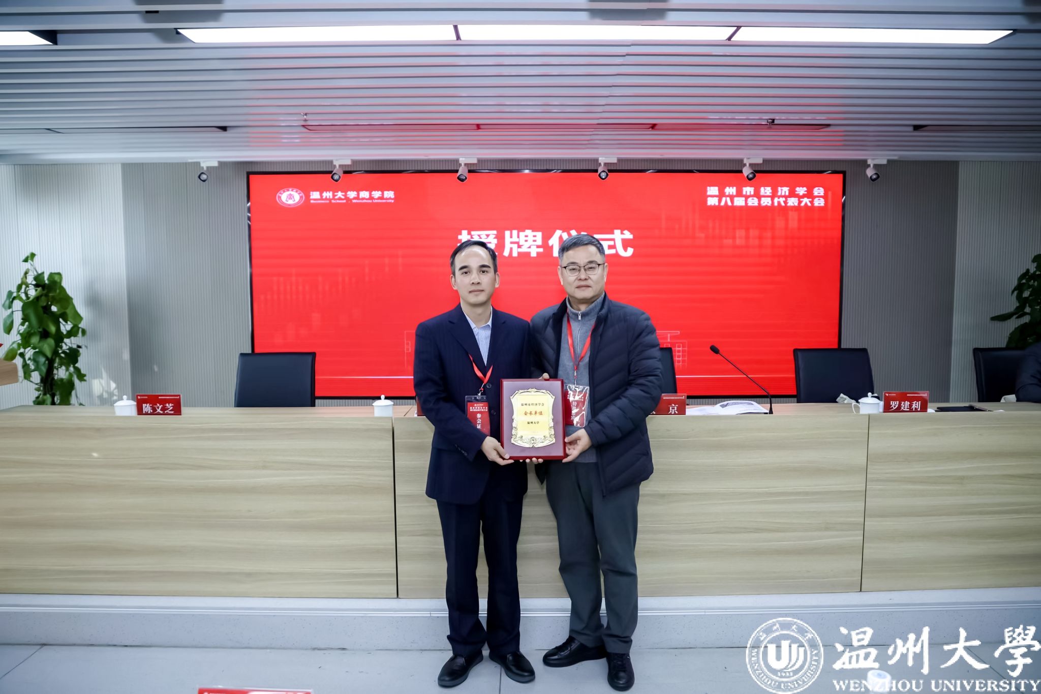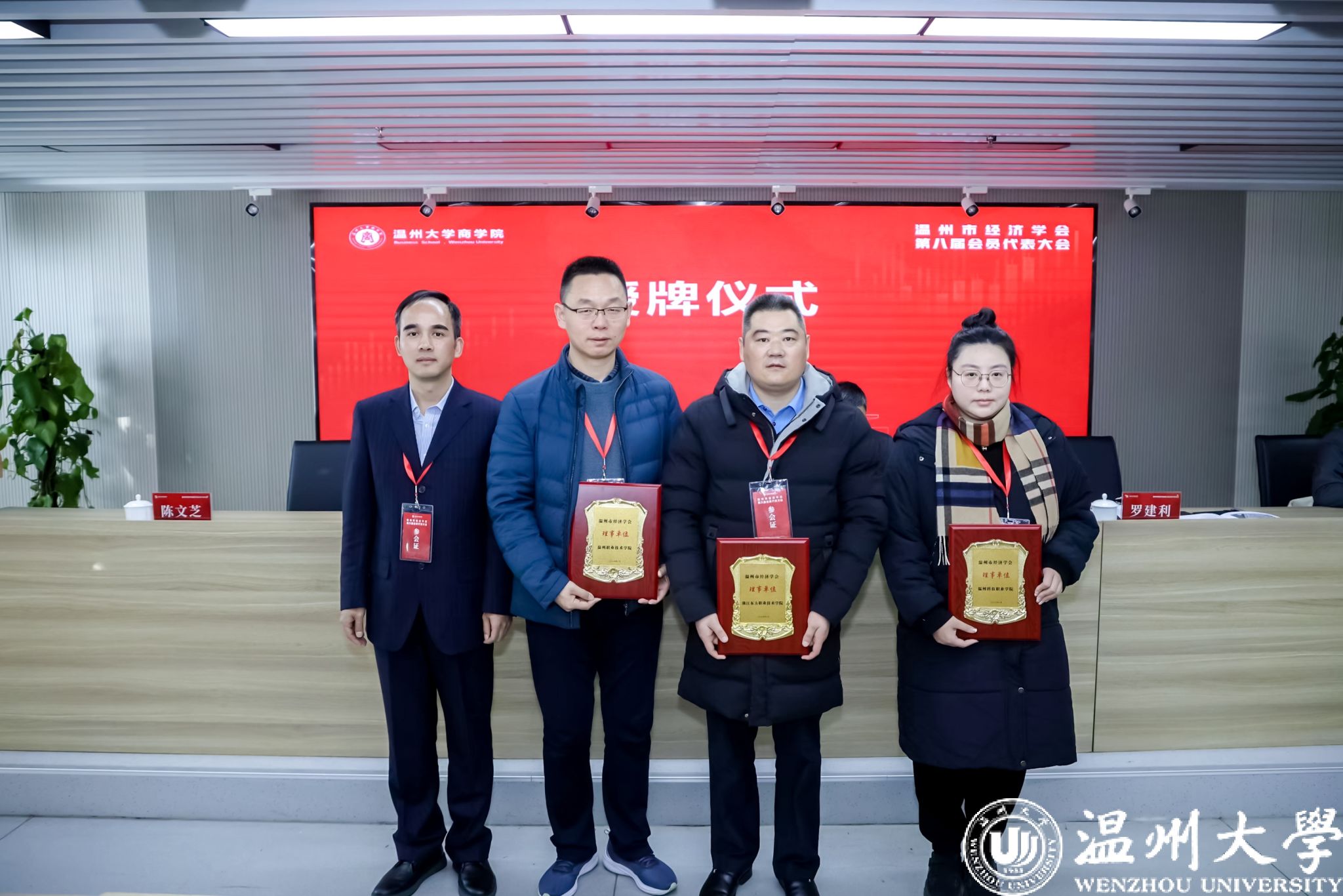 市社科院副院长张京、温州市社会组织管理局局长潘建勇、温州市经济学会新当选会长罗建利分别为会长单位、副会长单位和理事单位授牌。