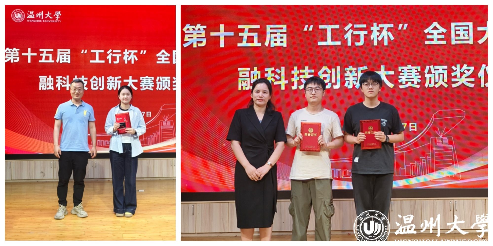 本届大赛中温州大学有五支团队脱颖而出,分别是获得省级三等奖、市级一等奖的韦松祺团队,获得市级二等奖的任书梵团队,获得三等奖的边家谊团队,以及获得优胜奖的朱聪团队和叶浩特团队,领导嘉宾为他们颁奖并合影留念。