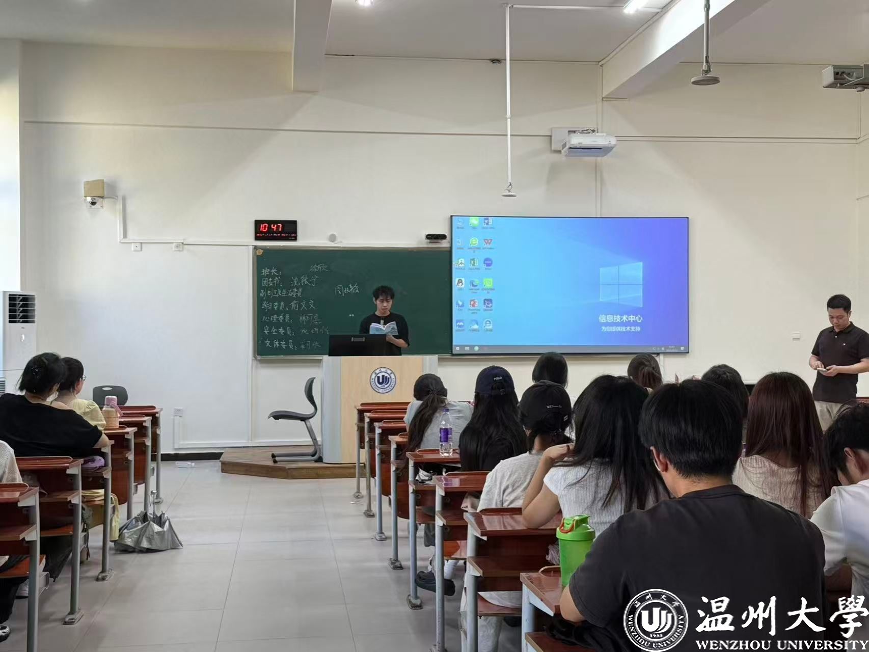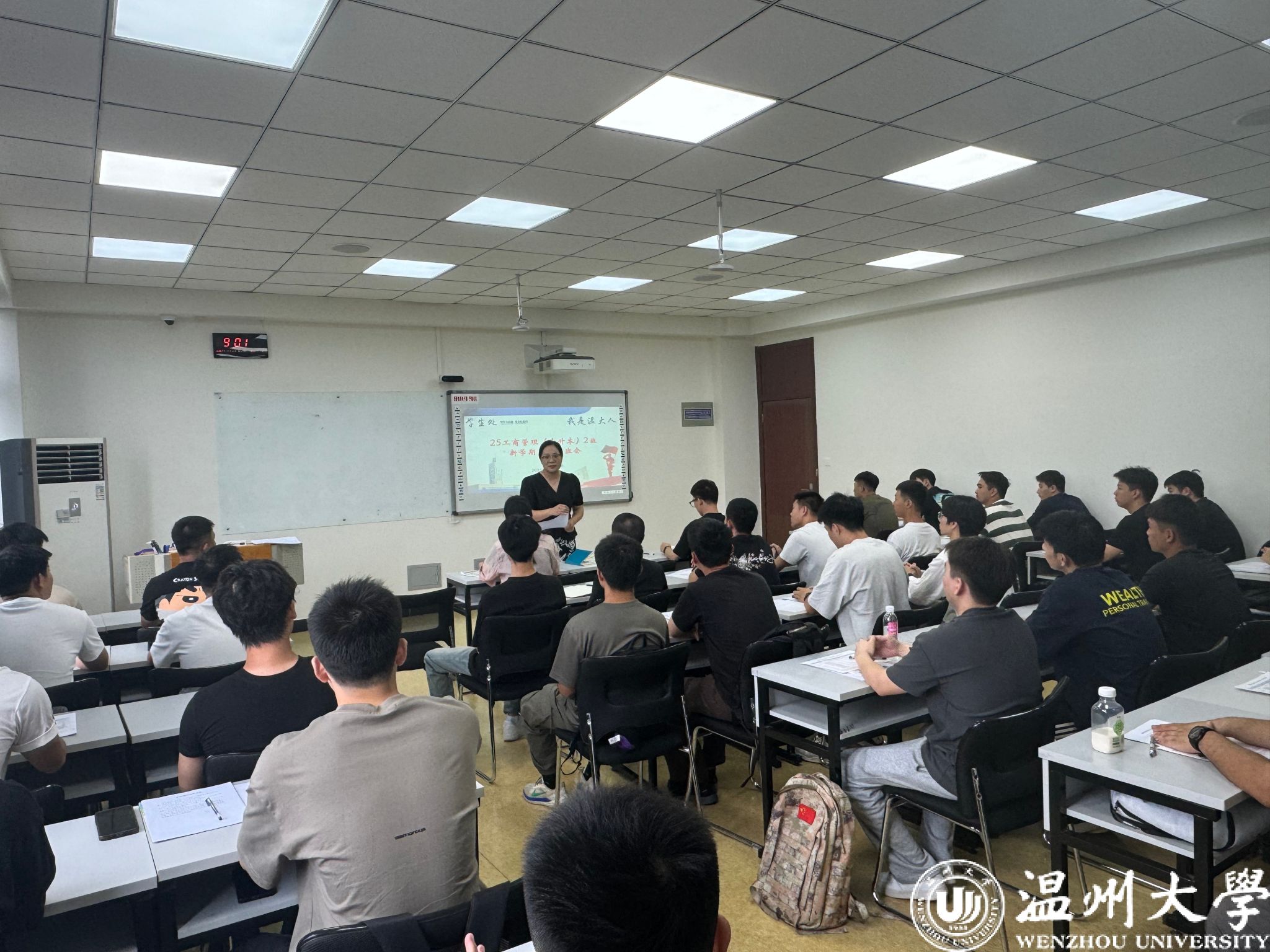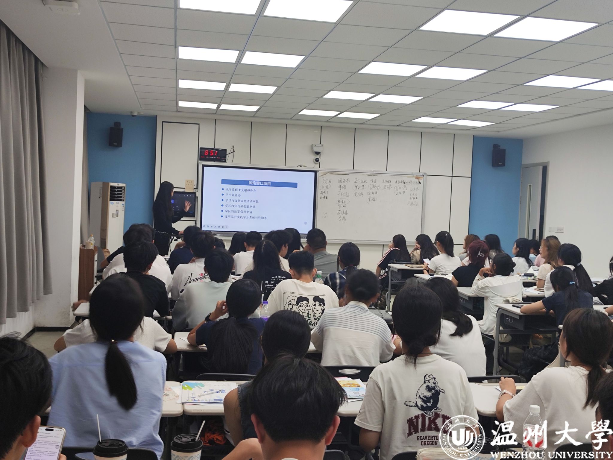 接着,进入事项解读环节。班主任们聚焦马克思主义宗教观,结合法规与校园实际,明确“宗教与教育相分离”原则;通过“校园贷”“刷单诈骗”等案例,讲解诈骗防范要点,提醒新生守护财产安全。班助解读《学生手册》中纪律处分条例、违规大功率电器使用规定;介绍必须关注的校园公众号、宿舍报修途径、校园通知查询方法、培养方案查询路径、幸福工坊地址,以及校院学生会、学生社团情况。