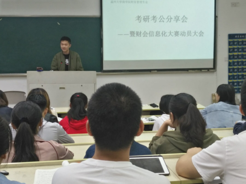 由财会系党支部牵头、张敏老师和陈建萍老师组织、温大会计协会协助落实的“考研考公分享会暨2019年财会信息化竞赛启动大会”于2019年5月8号在北校区3-401如期举行。本次会议酝酿了一个多月,邀请了来自2015级财管的候晨瑶、陈晓莎等5位考研考公的学生代表。候晨瑶同学以笔试第一和复试第一的成绩考进了浙江财经大学会计学学硕,单佳男同学以复试第一综合第八的成绩考入了浙江财经大学会计学专硕,韩海燕以前10的成绩考进了浙江工商大学会计学学硕,陈晓莎和鉏楷文以第二名的成绩分别考入绍兴国税和嘉兴国税。他们分别从考研的院校选择、时间进度安排、书籍课件选择、专业课程的准备、考公的准备等方面给学弟学妹们做了有关非常详细的分享与经验交流。张敏老师从决心、信心和恒心来鼓励大家,从学习氛围、如何备考和坚持以及专业课程设计来引导大家交流。最后陈建萍老师就今年的财会信息化竞赛做了简要的动员。本次活动是一次答疑解惑的思想交流,是一次优良学风的传承,更是一次支部建设融入学科专业建设的体现。