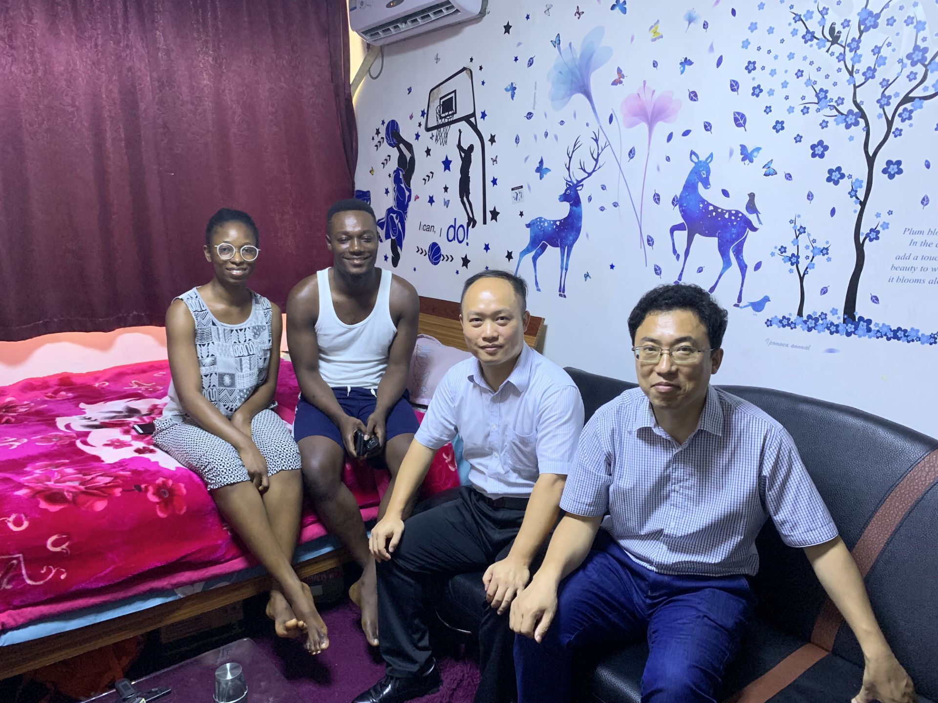 王洪斌主任首先向MICHAEL同学送上学院为其准备的温馨的小礼物,并向两位同学简单介绍了何为“百名教授访百家”。交谈中了解到,两位留学生同学在暑假里有不同的计划。暑期里,女朋友要回尼日利亚,在本国完成一些实习工作,之后会准备申请温大的研究生;而MICHAEL则要继续留在中国,他表示不单单要复习以往的课程知识,同时要准备温大研究生的申请工作。唐华书记和王洪斌主任从生涯规划角度和国际贸易专业发展前景的角度,给了他们很多实用的建议,并鼓励他们坚定目标,继续前行,合理规划学习和工作的时间分配,克服当下的一些困难,在中国创造属于自己的辉煌。此外,林大可老师叮嘱两位留学生暑假里要注意人生财产安全,遇到问题或困难要与学校老师多多沟通交流。