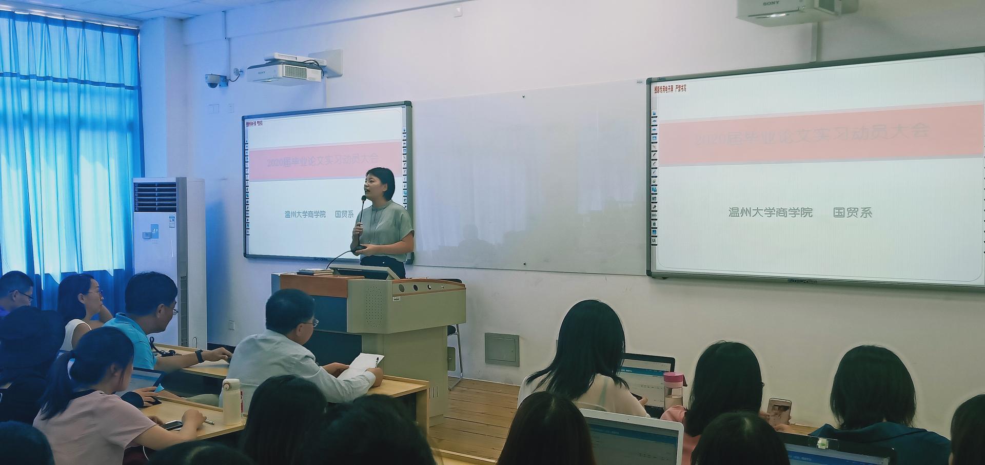国贸系2020届毕业论文和实习动员大会在北3-301教室召开。本次动员大会由国贸系马媛老师主持,国贸系毕业论文导师、16国贸本和18国贸专升本110名学生参加。