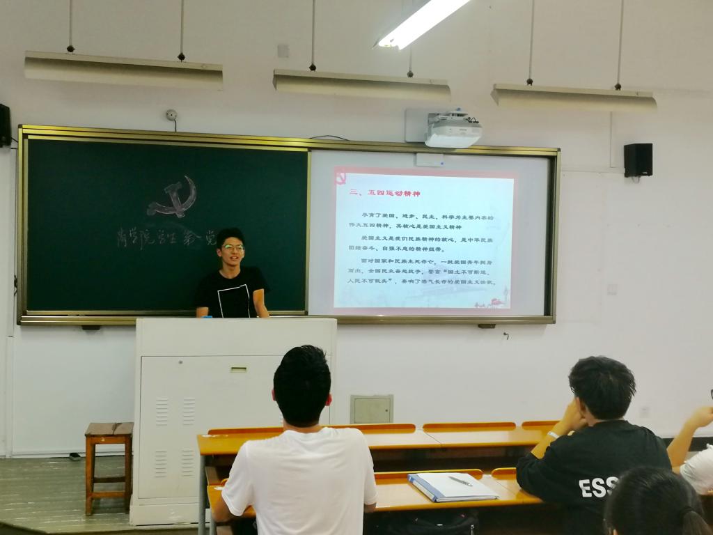 支部书记助理柯沙沙首先向大家介绍了本次讲坛的主题和流程,处在新时代的新生们,应该找到自己的方向,努力做一个有责任、有担当的人,勇敢地担当起新使命。接下来,由五位党支部成员依次上台进行经验分享。