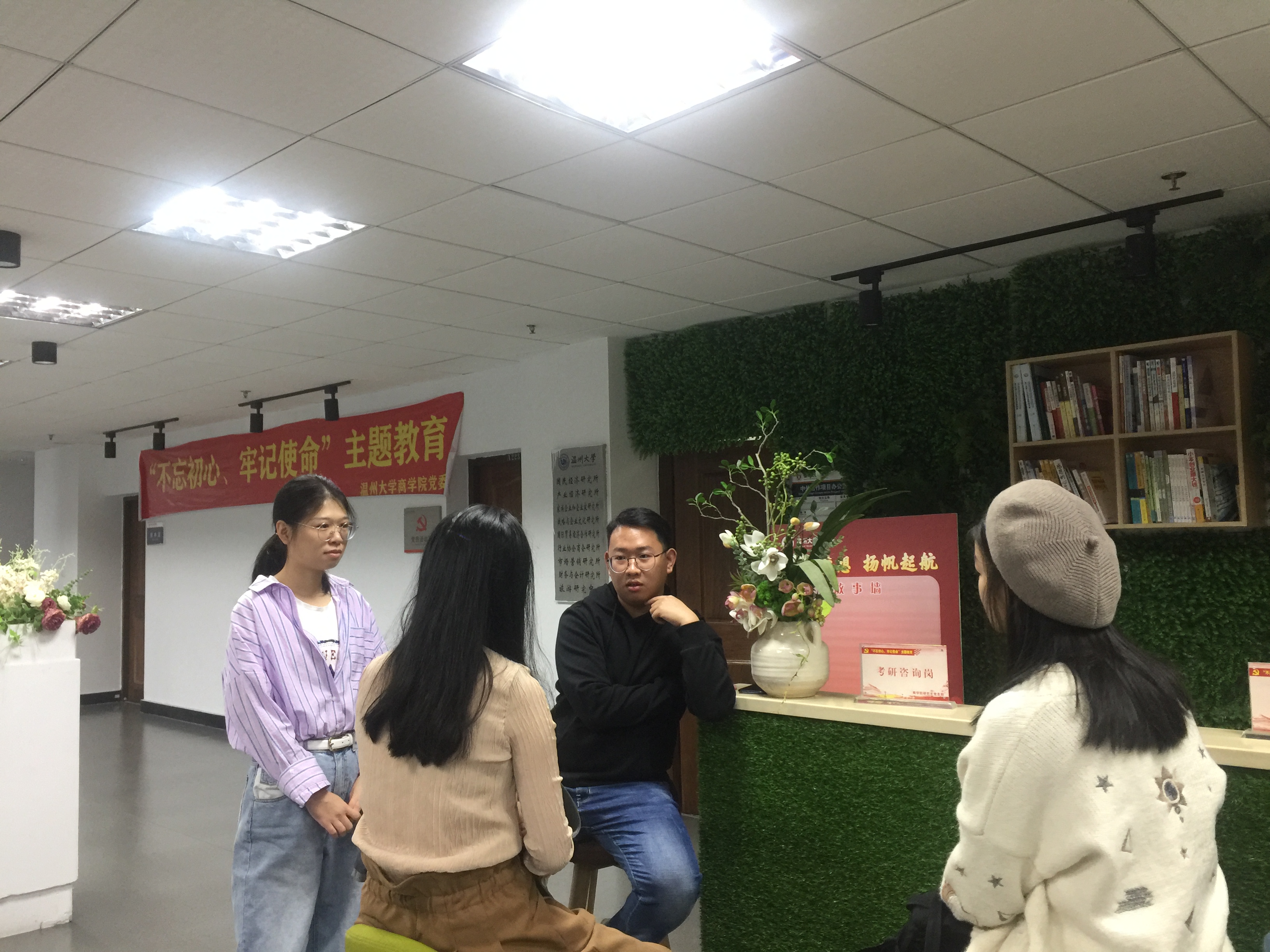 青春的梦想应该在奋斗中发芽,每一个踌躇满志的身影都将以最美的姿态迎接最耀眼的阳光。2019年11月 20日,免费黄色网站研究生党支部举办了“不忘初心、牢记使命”主题教育活动之“追逐梦想,扬帆起航”考研咨询会。