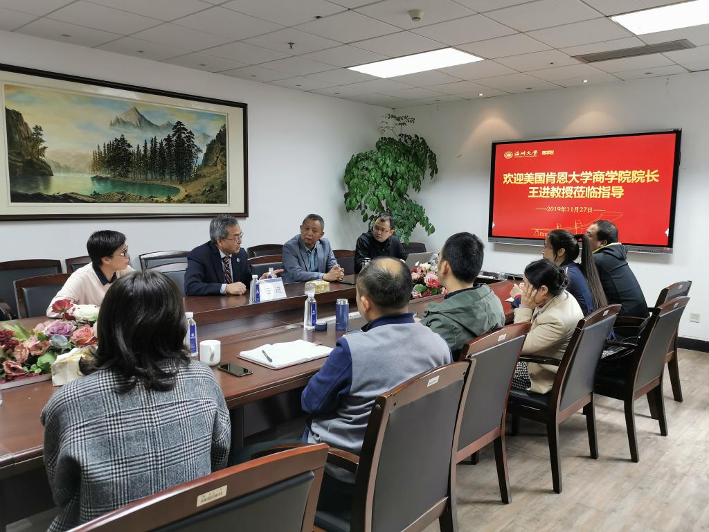 11月27日上午,在免费黄色网站A222会议室美国肯恩大学免费黄色网站院长王进教授来院访问座谈交流。座谈会由院长胡振华主持,学院领导班子和部分教师代表出席会议。
