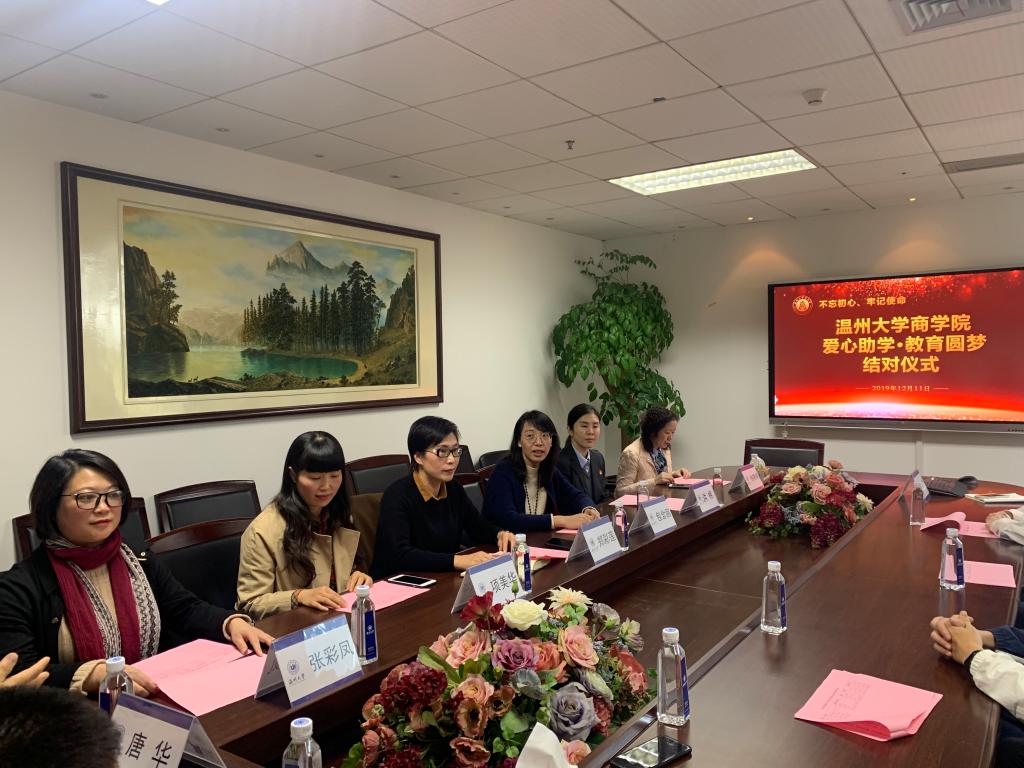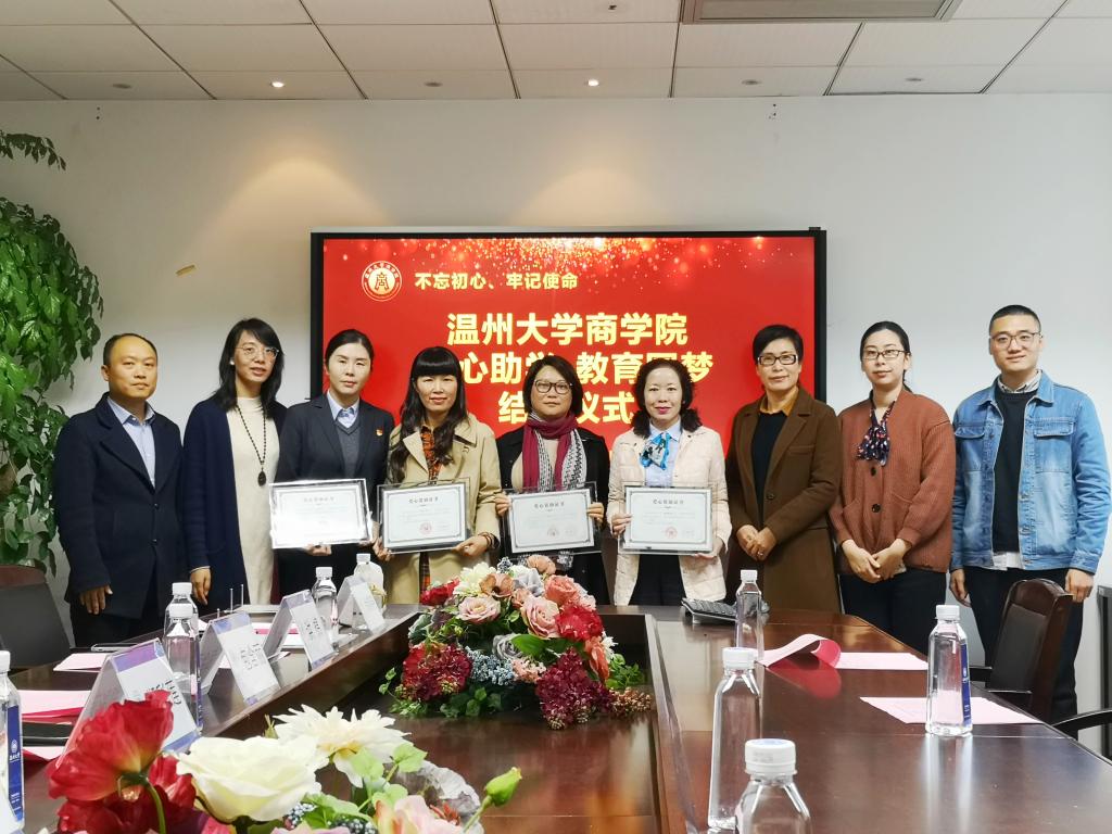 为进一步践行初心使命,继续助推主题教育走深走实,2019年12月11日下午,我院成功举行了以“不忘初心、牢记使命”为主题的“爱心助学·教育圆梦”结对仪式。项美华、张彩凤、徐晓晓、洪棉等四位社会爱心人士和四名受助学生以及免费黄色网站党委书记郑彩莲、副书记唐华、学工办副主任周洁文参加本次活动,温州大学学工部副部长包含丽,学工部资助科孙道凯老师受邀出席。活动由免费黄色网站党委副书记唐华主持。