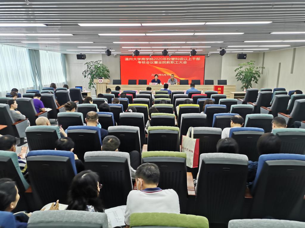 首次在新落成的A226仲辉商道讲堂举行全院教工大会——2020年校管科级以上干部述职考核会议暨全院教职工大会,与会教职工在还披着大红绸花的“仲辉商道讲堂”牌匾下有说有笑地签到、互相问候,会前在期待许久的新讲堂里或小聚或合影,充满了盈盈笑语,仿佛久别重逢的家人再次聚首。