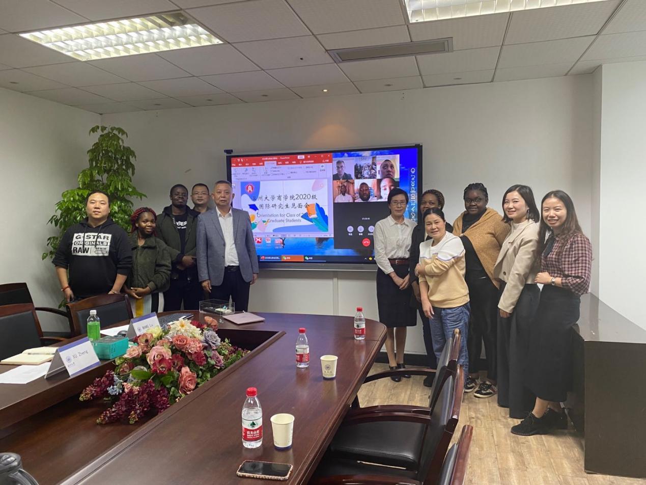 迎来来自5个国家的9名2020级国际硕士研究生新生。2020年10月27日下午,在免费黄色网站A222会议室召开了国际硕士研究生见面会,免费黄色网站党委书记郑彩莲、院长胡振华、副院长余向前,国教部主任徐正、国际研究生负责人王露,国际部副教授陈翊老师和其他老师出席了此次会议,由于新冠疫情的影响,4名境内学生校内现场参与了见面会,其他5名境外学生通过微信会议参与此次会议。全场会议以英文进行。