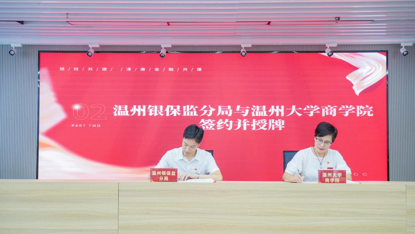 教工第一(金融)党支部签署合作共建协议。温州大学纪委副书记、纪检监察室主任、巡察办主任杨立淮和温州银保监局党委书记、局长朱燕军为四个共建支部颁发聘书。