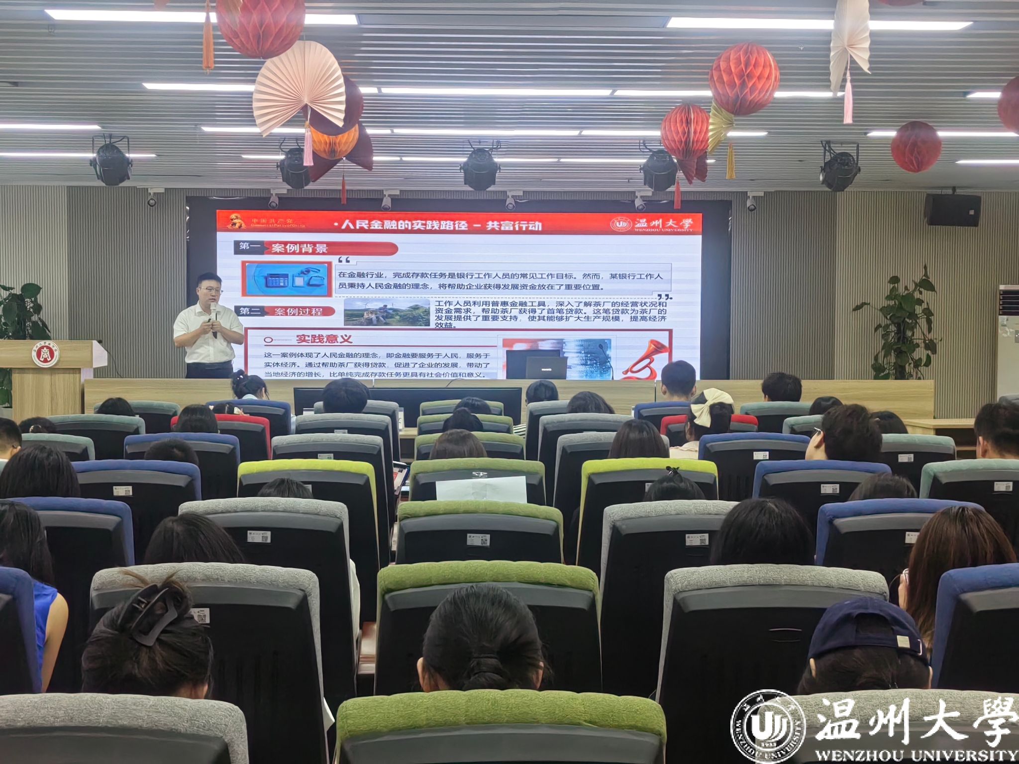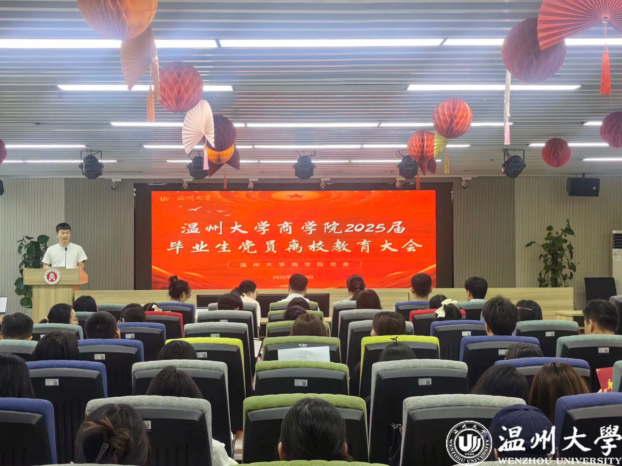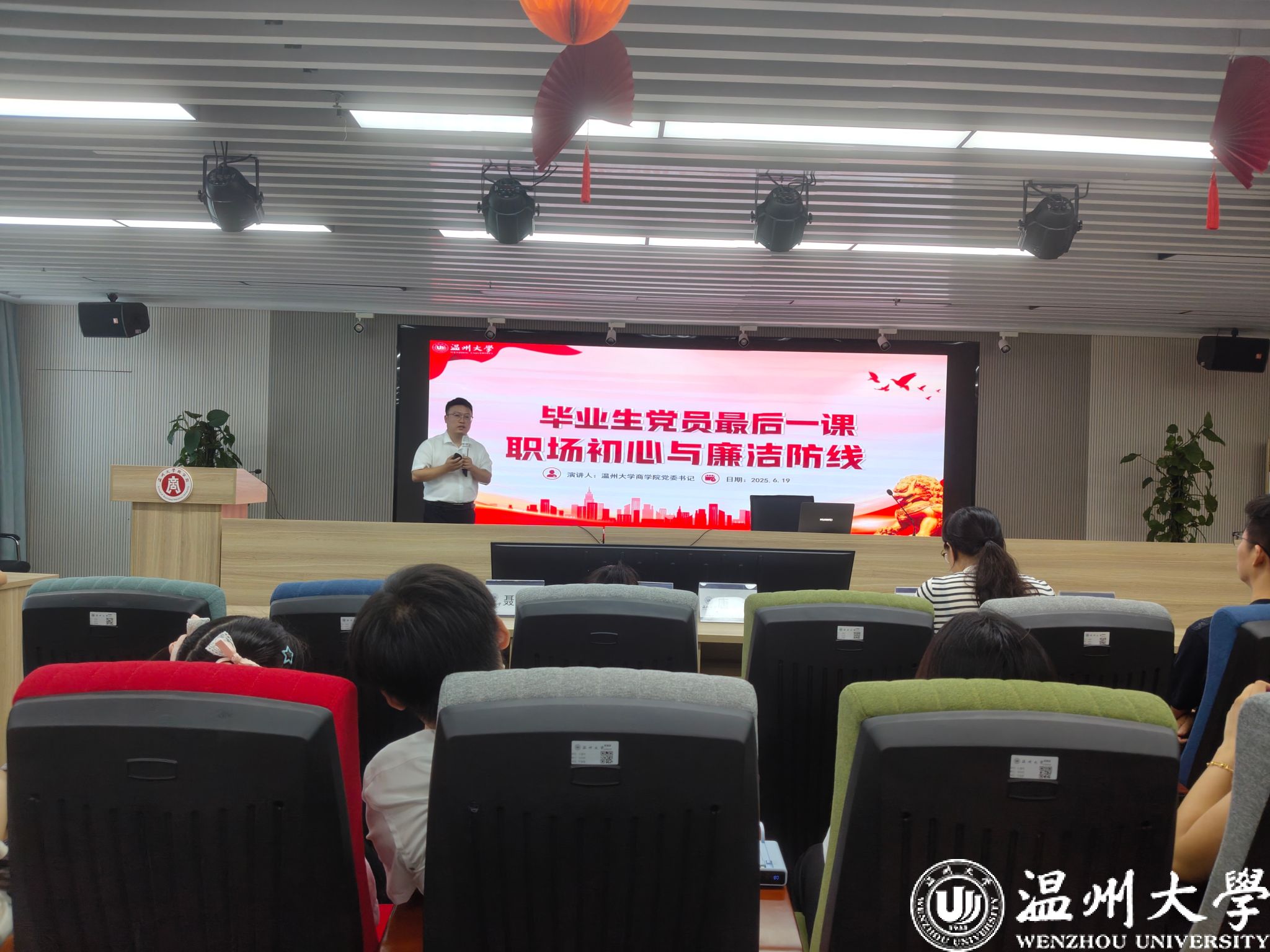 随后,唐华为全体毕业生党员讲授《职场初心与廉洁防线》专题党课。他结合自身实际、当前社会背景和职场实际,展示了金融专业的人民实践路径、银行高风险场景教学等等,深入剖析了党性修养、筑牢廉洁防线对个人发展和社会进步的重要性,要把信仰融入专业,要时刻以党员标准严格要求自己,将党性修养内化于心、外化于行;要明辨是非,严守纪律规矩,坚决守住拒腐防变的思想和道德底线,扣好职业生涯的“第一粒扣子”;更要将个人理想融入时代洪流,在各自的岗位上奋发有为,贡献青春力量,真正成为让党放心、让人民满意的先锋模范。