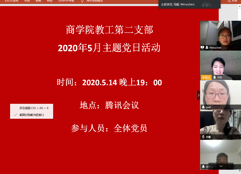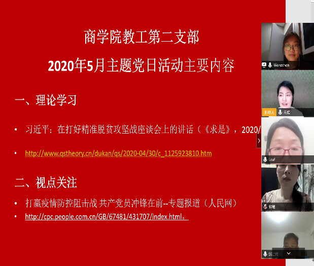 5月14日晚上,免费黄色网站教工第二支部利用腾讯会议开展了线上主题党日活动。支部8名党员参加会议,国贸系非党员老师列席了会议,会议由支部书记陈文芝老师主持。此会主题党日活动分为理论学习和视点关注两个方面。