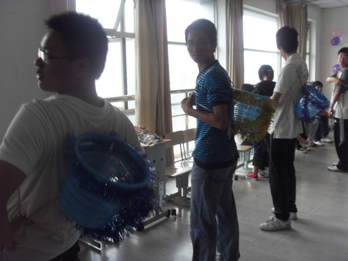 对场地经过一番装扮后,同学也陆续来到了这个约定地点。首先由心理委员陈述了今天班会的主题:齐心协力,同时讲述了此次班会的目的和对为来的希望。接着活动结合着主题展开。心理委员按照座位的摆放将同学分成了两组。